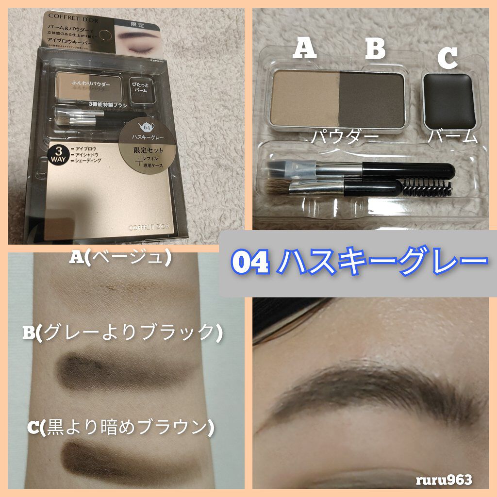 - ぴたっとバームとふんわりパウダーで眉の毛流れ、立体感のある仕上がり※、続くシェーディングやアイシャドウにも使えるアイブロウパレット ※色の陰影によるメイクアップ効果による ぴたっと密着バーム&ふんわり定着パウダーの合わせ使いで、汗・マスク着用時の蒸気にも対応し、毛が生えていない部分も消えにくい、ウォータープルーフタイプ。 ● バームとパウダーの質感の使い分けで、より精密な毛流れや影を表現。 ● シェーディングやアイシャドウまで、顔中使えるマルチタイプ。 ● 使い心地にもこだわった特製ブラシ付き。 コフレドール アイブロウキーパー 全4 種 3.0g こちらの商品は詰め替え用〈レフィル〉です。別売りのアイブロウキーパー用ケースにセットしてお使いください。 アイブロウキーパー用ケース1種(税込770円 ※編集部調べ) 01メルティブラウン(ライトブラウン系) 02ココアブラウン(ブラウン系) 03アッシュピンク(ピンク系) 04ハスキーグレー(グレー系) <数量限定:初回限定版> シェーディングやアイシャドウにも使えるマルチタイプで、絶妙なニュアンスカラーを揃えたウォータープルーフタイプのアイブロウパレットのレフィルにケースがついた便利なセット。 セット内容 コフレドール アイブロウキーパー3.0ℊ(現品) コフレドール アイブロウキーパー用ケース(現品)