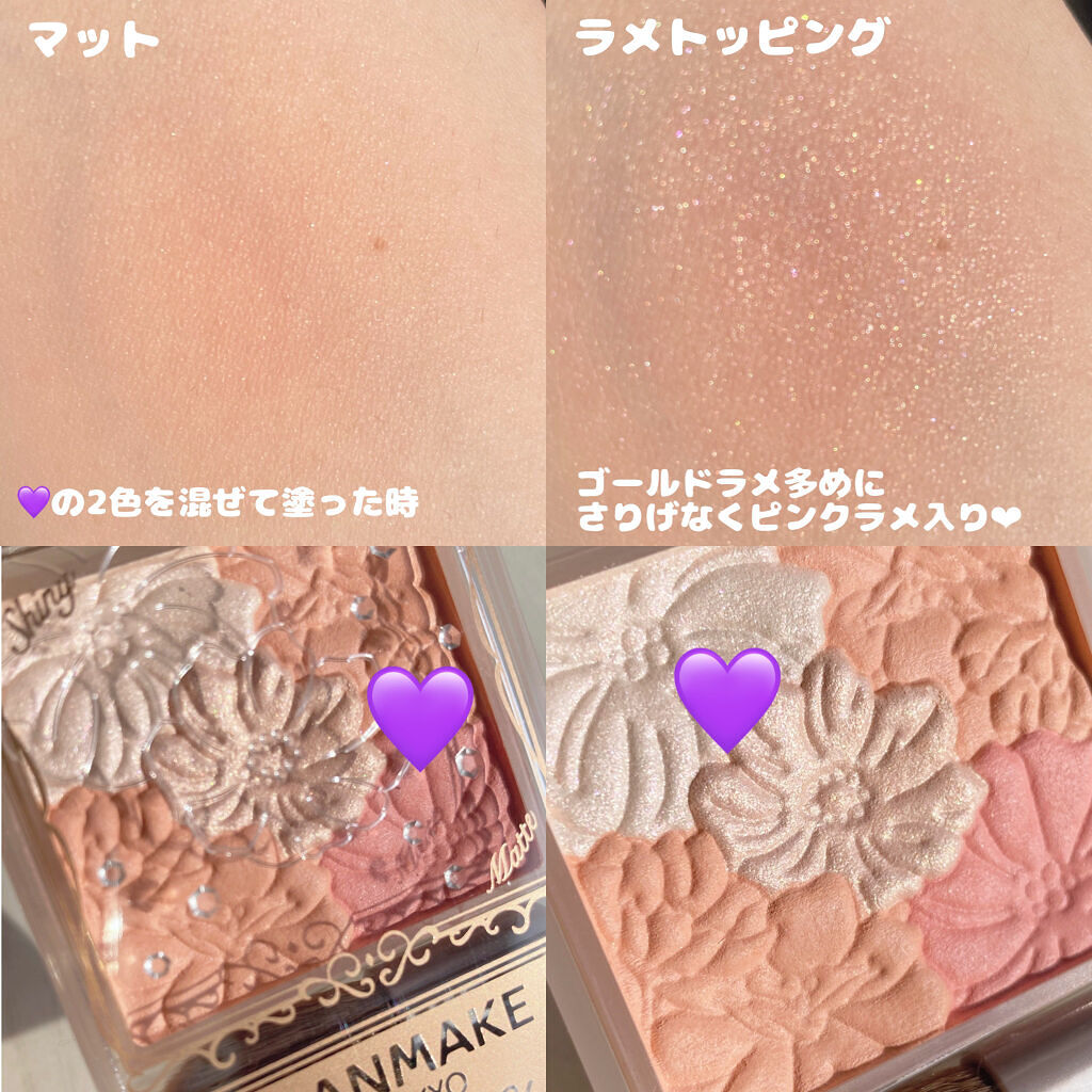 - ”発光ツヤ×透けマット”が1つに 混ぜ方次第で自分好みの仕上がりを作れる4色チーク 透け感のあるマットと繊細パール、2つの質感をブレンドして 肌に溶け込むような透けツヤ発色を楽しめるチーク。 しっとりなめらかなパウダーで、粉飛びしにくく、肌に密着します