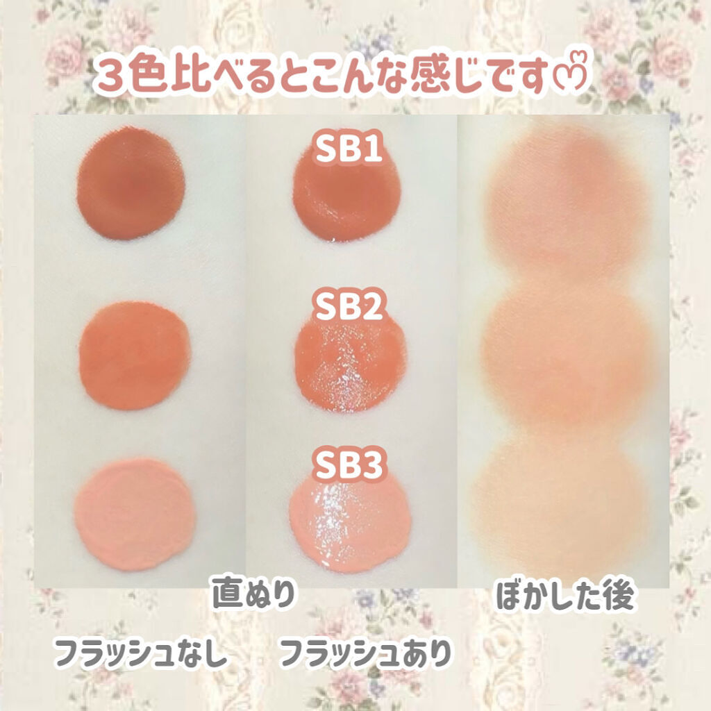 - SB1. コージー ローズベージュ 水添ポリイソブテン, マイカ, オクチルドデカノール, ジ安息香酸DPG, 水添ポリ(C6-14オレフィン), ポリグリセリル-2トリイソステアリン, 水添(スチレン/イソプレン)コポリマー, トリメチルシロキシケイ酸, イソドデカン, 酸化チタン(CI77891), セスキオレイン酸ソルビタン, 酸化鉄(CI77491), 1,2-ヘキサンジオール, ジステアルジモニウムヘクトライト, 酸化鉄(CI77492), 黄5(CI15985), 酸化鉄(CI77499), 炭酸プロピレン, フェノキシエタノール, シリル化シリカ, 赤202(CI15850), トリエトキシカプリリルシラン SB2. コーラル ムード 水添ポリイソブテン, マイカ, オクチルドデカノール, ジ安息香酸DPG, 水添ポリ(C6-14オレフィン), ポリグリセリル-2トリイソステアリン, 水添(スチレン/イソプレン)コポリマー, トリメチルシロキシケイ酸, イソドデカン, 酸化チタン(CI77891), セスキオレイン酸ソルビタン, 酸化鉄(CI77491), 1,2-ヘキサンジオール, ジステアルジモニウムヘクトライト, 酸化鉄(CI77492), 黄4(CI19140), フェノキシエタノール, 炭酸プロピレン, 黄5(CI15985), シリル化シリカ, 赤202(CI15850), トリエトキシカプリリルシラン SB3. クラシックピーチ 水添ポリイソブテン, マイカ, オクチルドデカノール, ポリグリセリル-2トリイソステアリン, ジ安息香酸DPG, 酸化チタン(CI77891), 水添(スチレン/イソプレン)コポリマー, トリメチルシロキシケイ酸, イソドデカン, 水添ポリ(C6-14オレフィン), セスキオレイン酸ソルビタン, ジステアルジモニウムヘクトライト, 1,2-ヘキサンジオール, 酸化鉄(CI77492), フェノキシエタノール, 炭酸プロピレン, 黄4(CI19140), 酸化鉄(CI77491), 黄5(CI15985), シリル化シリカ, 赤202(CI15850), トリエトキシカプリリルシラン