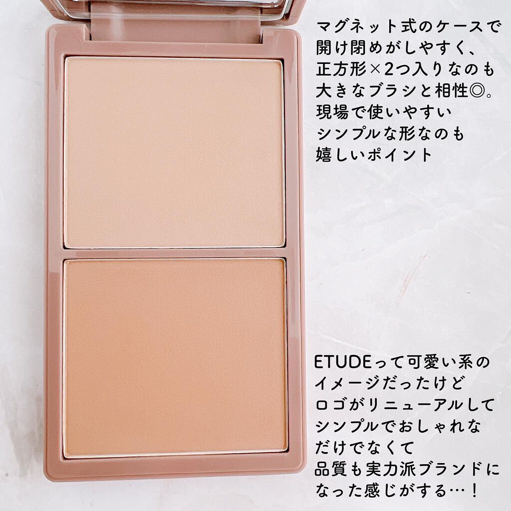 エチュードのコントゥアパウダーを購入しました(՞˶・֊・˶՞)🤍 韓国コスメによくありますが、蓋が磁石で閉まるようになっており、ネイルをしている爪にも危険がなく、ありがたいです☆ 粉質は細かくふんわりしていて、しっかりマットという感じです🩷️🩷️🩷️ シェーディングパウダーは、少しでもしっとり感があると、お肌にのせたときにムラづきしてしまうので、このドマットの質感がとっても使いやすいです⠉̮⃝︎︎ ⠉̮⃝︎︎ ⠉̮⃝︎︎ ブラシが苦手な私でもお肌にしっかり密着させることができます🌷.* ちょうどいい影感で、テクニック要らずの立体顔ができますෆෆෆෆ