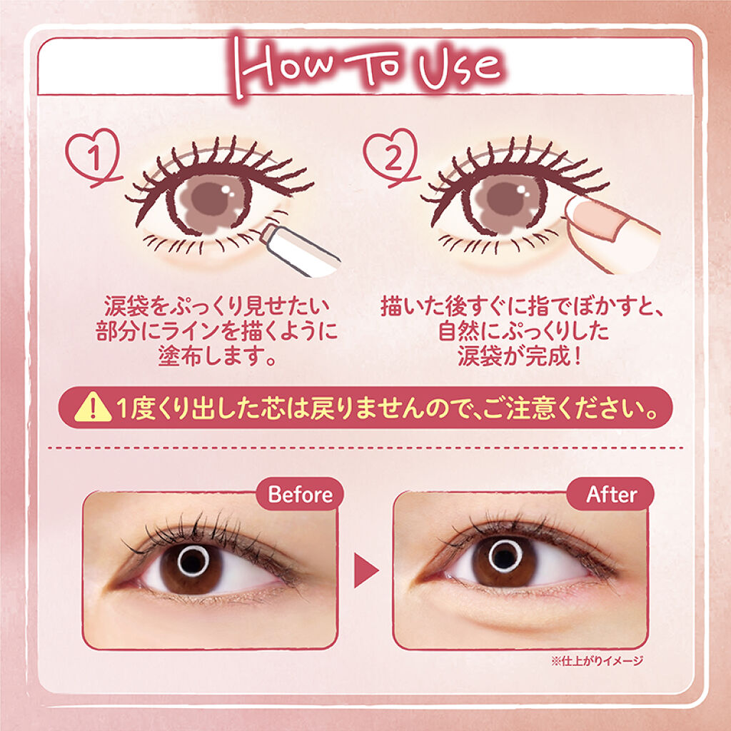 - ぷっくり自然な生まれつき風涙袋を作る3mmの細芯コンシーラー ラインを描いた後すぐはぼかしやすく、乾いた後はお肌に高密着! 水・汗・涙・皮脂・こすれに強く、描きたての仕上がりが長時間キープされます。