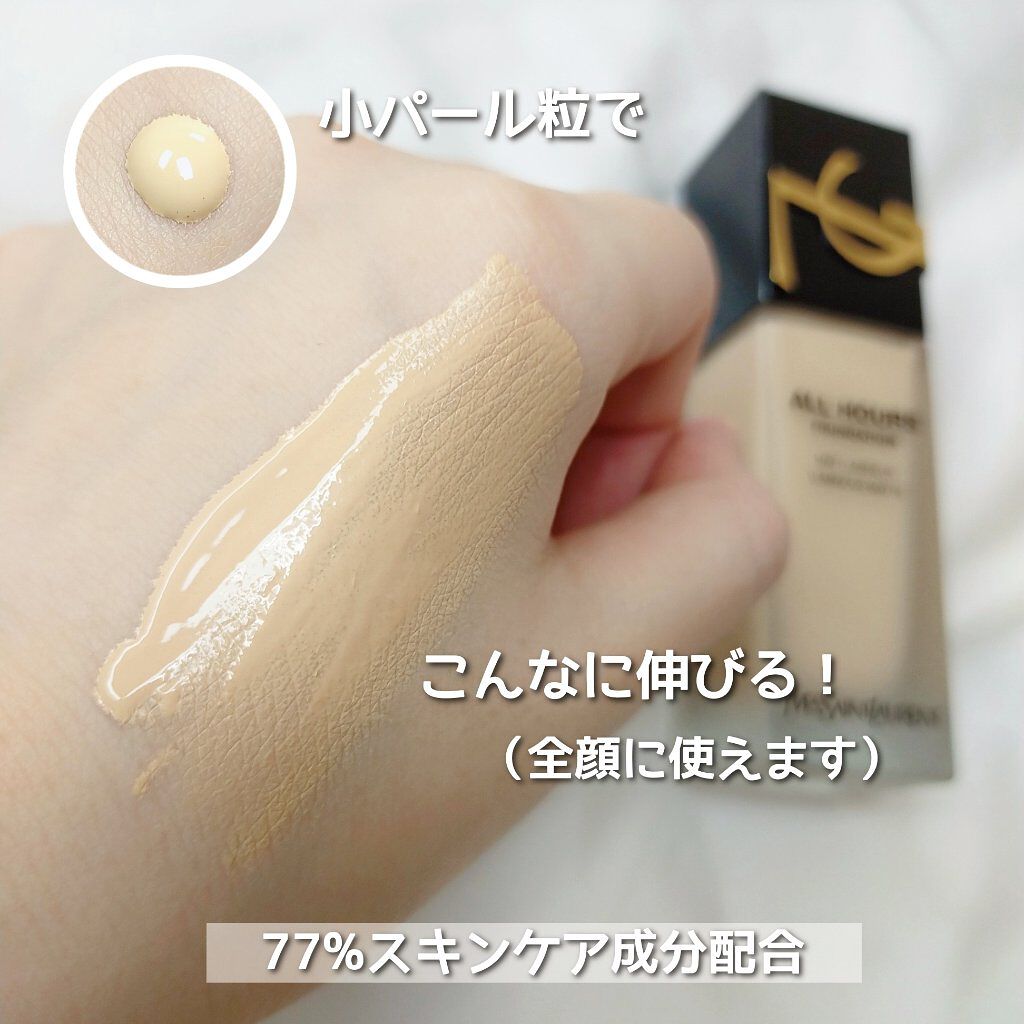 - 新技術*、”スキン フュージング テクノロジー”を搭載。 細かく整ったキメの再現を目指して、理想の肌そのものの質感になりすますフォーミュラを実現。 * YSLにおいて カバーしていることさえ気づかせない、まるで"消えるカバー力"。 マスクプルーフ、ウォータープルーフ、スポーツプルーフのトリプルプルーフ処方で、崩れの原因を徹底ブロック。つけたての美しさ続く。 カバー力は極限まで高く、極薄のヴェールが滑らかに肌をつつみ、つけていることを忘れるほどの心地よさ。 ジャスミンエキス(*1)、ヒアルロン酸(*2)、紅藻エキス(*3)などをはじめとする77%スキンケア成分配合で1日後、そして7日後の素肌さえも美しく。 艶 ★★☆☆ カバー力 ★★★★ SPF39/PA+++ *1 ソケイ花エキス(整肌成分) *2 ヒアルロン酸Na(整肌成分) *3 ジャニアルベンスエキス(整肌成分) 小パール1粒分をプッシュし、全顔に伸ばして足りない部分があれば追加してください。 1.ほほの高い位置にスタンプを押すように置いていく。 2.指の腹で肌を覆いながら優しく押し込むように、手の体温で温めながら伸ばしていく。 3.あご先もとんとんとなじませる。フェイスラインと額は、すーっと滑らせることで立体感にある仕上がりに。 4.クマや赤みなど気になるところあれば、手でとんとんとなじませる。