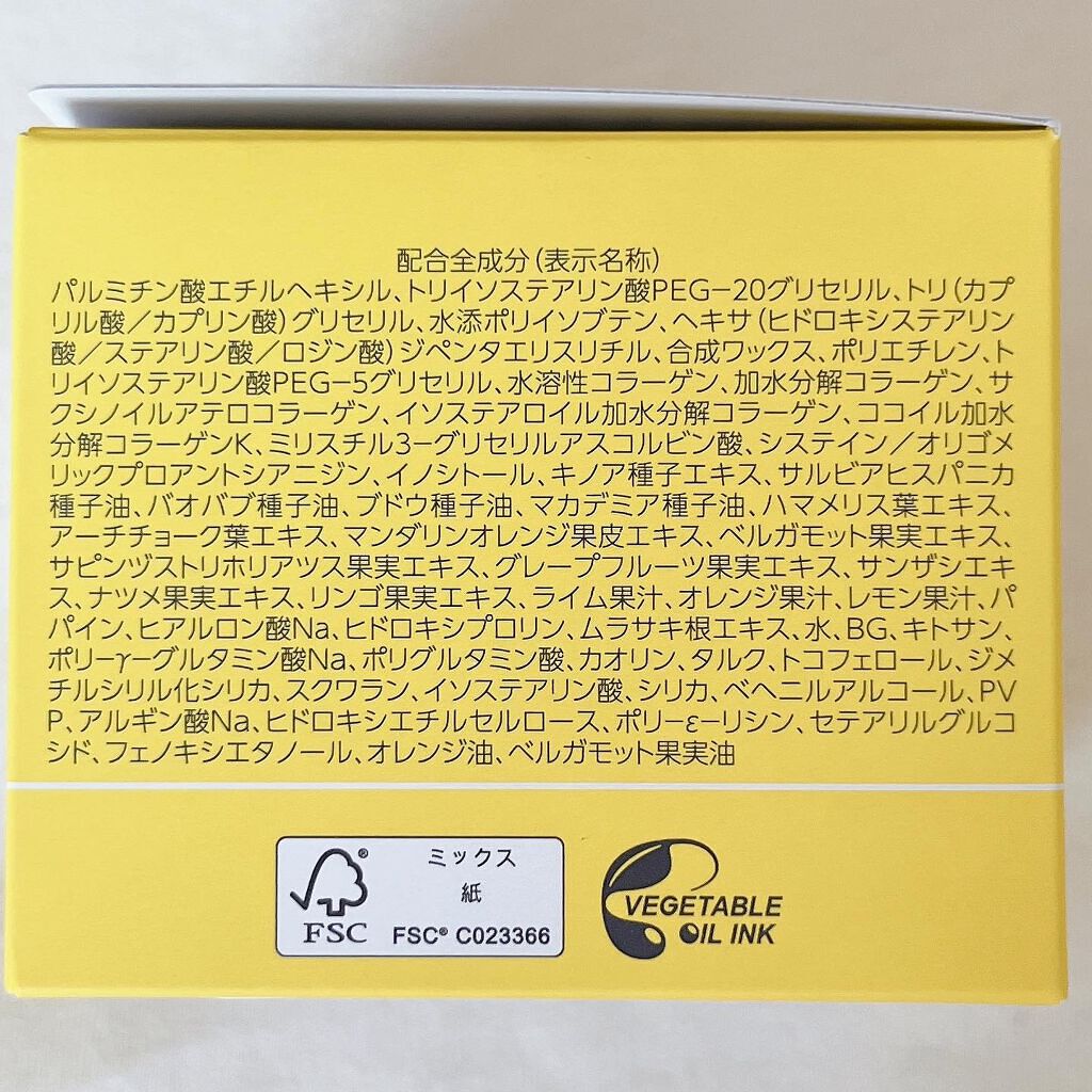 - <75g> パルミチン酸エチルヘキシル、トリイソステアリン酸PEG-20グリセリル、トリ(カプリル酸/カプリン酸)グリセリル、水添ポリイソブテン、合成ワックス、ヘキサ(ヒドロキシステアリン酸/ステアリン酸/ロジン酸)ジペンタエリスリチル、トリイソステアリン酸PEG-5グリセリル、水溶性コラーゲン、加水分解コラーゲン、サクシノイルアテロコラーゲン、イソステアロイル加水分解コラーゲン、ココイル加水分解コラーゲンK、ミリスチル3−グリセリルアスコルビン酸、システイン/オリゴメリックプロアントシアニジン、イノシトール、キノア種子エキス、サルビアヒスパニカ種子油、バオバブ種子油、ブドウ種子油、マカデミア種子油、ハマメリス葉エキス、アーチチョーク葉エキス、マンダリンオレンジ果皮エキス、ベルガモット果実エキス、サピンヅストリホリアツス果実エキス、グレープフルーツ果実エキス、サンザシエキス、ナツメ果実エキス、リンゴ果実エキス、ライム果汁、オレンジ果汁、レモン果汁、パパイン、ヒアルロン酸Na、ヒドロキシプロリン、ムラサキ根エキス、水、BG、キトサン、ポリ-γ-グルタミン酸Na、ポリグルタミン酸、カオリン、タルク、トコフェロール、ジメチルシリル化シリカ、スクワラン、イソステアリン酸、シリカ、ベヘニルアルコール、PVP、アルギン酸Na、ヒドロキシエチルセルロース、ポリ-ε-リシン、セテアリルグルコシド、フェノキシエタノール、オレンジ油、ベルガモット果実油 <ポムポムプリンデザイン(75g)> パルミチン酸エチルヘキシル、トリイソステアリン酸PEG-20グリセリル、トリ(カプリル酸/カプリン酸)グリセリル、水添ポリイソブテン、合成ワックス、ヘキサ(ヒドロキシステアリン酸/ステアリン酸/ロジン酸)ジペンタエリスリチル、トリイソステアリン酸PEG-5グリセリル、水溶性コラーゲン、加水分解コラーゲン、サクシノイルアテロコラーゲン、イソステアロイル加水分解コラーゲン、ココイル加水分解コラーゲンK、ミリスチル3−グリセリルアスコルビン酸、システイン/オリゴメリックプロアントシアニジン、イノシトール、キノア種子エキス、サルビアヒスパニカ種子油、バオバブ種子油、ブドウ種子油、マカデミア種子油、ハマメリス葉エキス、アーチチョーク葉エキス、マンダリンオレンジ果皮エキス、ベルガモット果実エキス、サピンヅストリホリアツス果実エキス、グレープフルーツ果実エキス、サンザシエキス、ナツメ果実エキス、リンゴ果実エキス、ライム果汁、オレンジ果汁、レモン果汁、パパイン、ヒアルロン酸Na、ヒドロキシプロリン、ムラサキ根エキス、水、BG、キトサン、ポリ-γ-グルタミン酸Na、ポリグルタミン酸、カオリン、タルク、トコフェロール、ジメチルシリル化シリカ、スクワラン、イソステアリン酸、シリカ、ベヘニルアルコール、PVP、アルギン酸Na、ヒドロキシエチルセルロース、ポリ-ε-リシン、セテアリルグルコシド、フェノキシエタノール、オレンジ油、ベルガモット果実油 <ちいかわ限定デザイン> シリカ、カオリン、水、ベヘニルアルコール、BG、ヒアルロン酸Na、フェノキシエタノール、タルク、スクワラン、トコフェロール、水溶性コラーゲン、ライム果汁、マンダリンオレンジ果皮エキス、サンザシエキス、マカデミア種子油、パルミチン酸エチルヘキシル、加水分解コラーゲン、ヒドロキシエチルセルロース、イソステアリン酸、ムラサキ根エキス、水添ポリイソブテン、ベルガモット果実油、サピンヅストリホリアツス果実エキス、セテアリルグルコシド、ヘキサ(ヒドロキシステアリン酸/ステアリン酸/ロジン酸)ジペンタエリスリチル、ポリグルタミン酸、アルギン酸Na、バオバブ種子油、オレンジ油、トリ(カプリル酸/カプリン酸)グリセリル、トリイソステアリン酸PEG-20グリセリル、トリイソステアリン酸PEG-5グリセリル、ハマメリス葉エキス、アーチチョーク葉エキス、PVP、サルビアヒスパニカ種子油、パパイン、レモン果汁、グレープフルーツ果実エキス、オレンジ果汁、ナツメ果実エキス、リンゴ果実エキス、ココイル加水分解コラーゲンK、ヒドロキシプロリン、イノシトール、合成ワックス、ジメチルシリル化シリカ、ポリ-ε-リシン、キトサン、システイン/オリゴメリックプロアントシアニジン、ポリ-γ-グルタミン酸Na、サクシノイルアテロコラーゲン、ブドウ種子油、ベルガモット果実エキス、キノア種子エキス、イソステアロイル加水分解コラーゲン、ミリスチル3−グリセリルアスコルビン酸 <ポムポムプリン 限定デザイン> パルミチン酸エチルヘキシル、トリイソステアリン酸PEG-20グリセリル、トリ(カプリル酸/カプリン酸)グリセリル、水添ポリイソブテン、合成ワックス、ヘキサ(ヒドロキシステアリン酸/ステアリン酸/ロジン酸)ジペンタエリスリチル、トリイソステアリン酸PEG-5グリセリル、水溶性コラーゲン、加水分解コラーゲン、サクシノイルアテロコラーゲン、イソステアロイル加水分解コラー