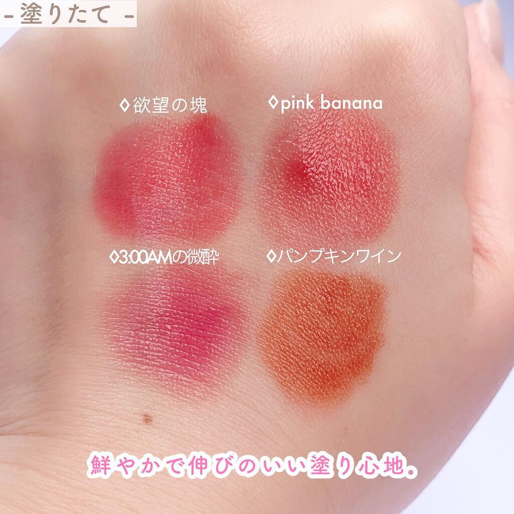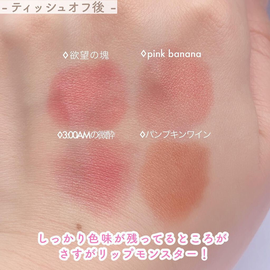 めっっっっっちゃ色綺麗…! 秋冬に使いたいくすみカラーが揃ってます。 M01 #深紅の闇くすんだレッドコーラル。 落ち着いた色味だけど華やかさもあって綺麗〜。色っぽ感出したいならこれ。 M02 #枯れない桜めーーーーちゃかわいい。 ナチュラルなベージュピンク。今までのリプモンの中で1番ナチュラルだと思う! M03 #祝いの紙吹雪モードなモーヴピンクでトレンド感No1カラー。 ブルベさん向きだけどイエベの方も使いやすいカラーです💁♀️♡ M04 #ゴーストムーン0:00AM落ち着いたテラコッタカラー。 秋っぽくてメイクに1番合いそう。オレンジリップ好きさん間違いなし。 M05 #泥霧スモーキーなブラウンオレンジが大人っぽい雰囲気。 抜け感を出したい時に使えるカラー◎ 軽やかでふんわりとした質感。ふわふわなチップでぼかしやすくグラデーションも綺麗に仕上がりました🥰 落ちなさも安定過ぎてもはや説明不要、、、! 今回も欠品決定の優勝リップでした。