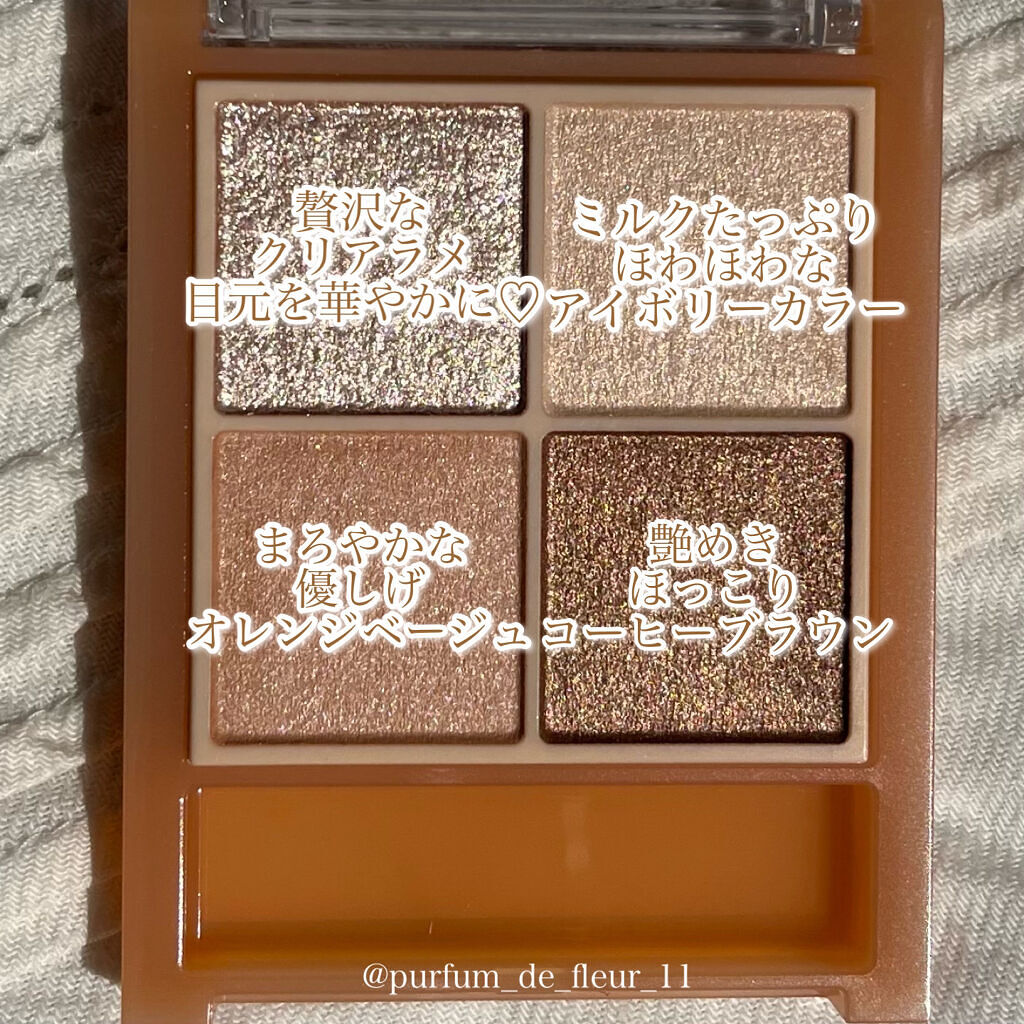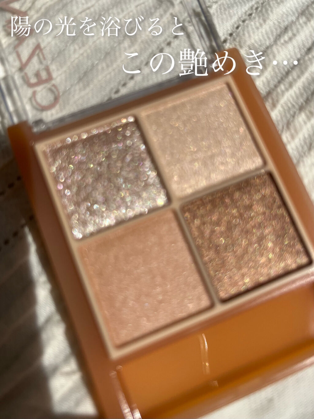- ラメ・パール・マット3質感の4色アイシャドウ。 肌馴染みの良いベージュを基調としたカラー。ラメ・パール・マットの3質感を重ねて、自然にまぶたを強調し奥行のある大きな目元へ。 しっとり溶け込むような柔らかなパウダーなので、スルスル伸びてまぶたにピタッと密着。保湿成分(スクワラン・ホホバ種子油)配合。
