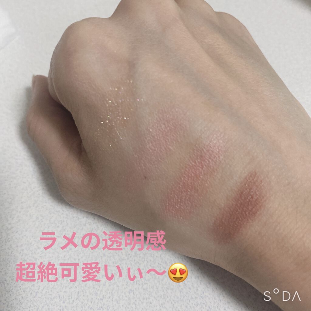 右上のブラウンが絶妙な発色で使いやすい!👏 発色しすぎると、途端に使いにくいですがシアーに締めてくれるのでナチュラルに印影がついて端正な目元に仕上げてくれます♡ ラメは眩ゆいため、のせすぎると途端にチープな印象になるので控えめにすることで上品に仕上がります。 左下のぷにぷにラメは華やかさがあって、指でとる際には、強く押し付けるとひび割れてくずれるので要注意♡(遊びすぎました😅) 左上のピンクのくすみ加減が超絶可愛い😍 ラメの匙加減で大人のなかにあどけなさをだせる若見えパレット👏