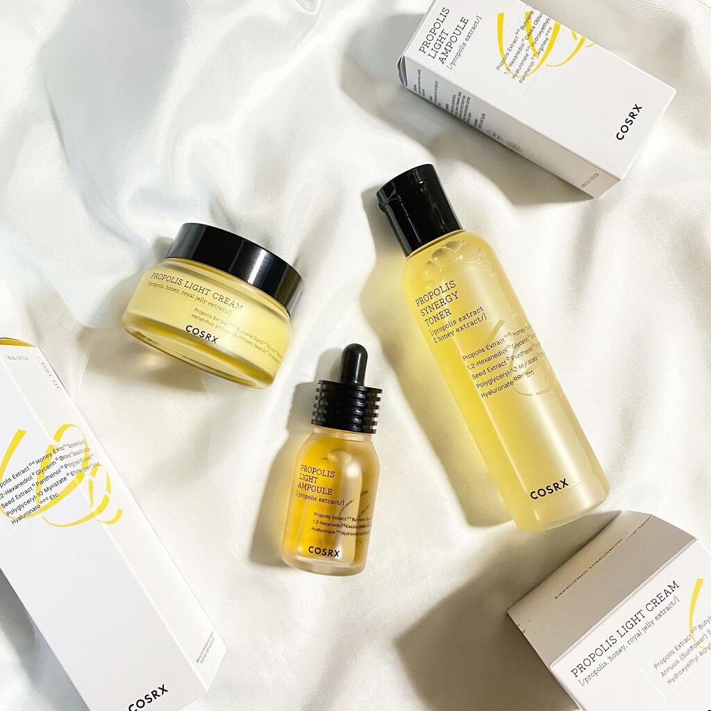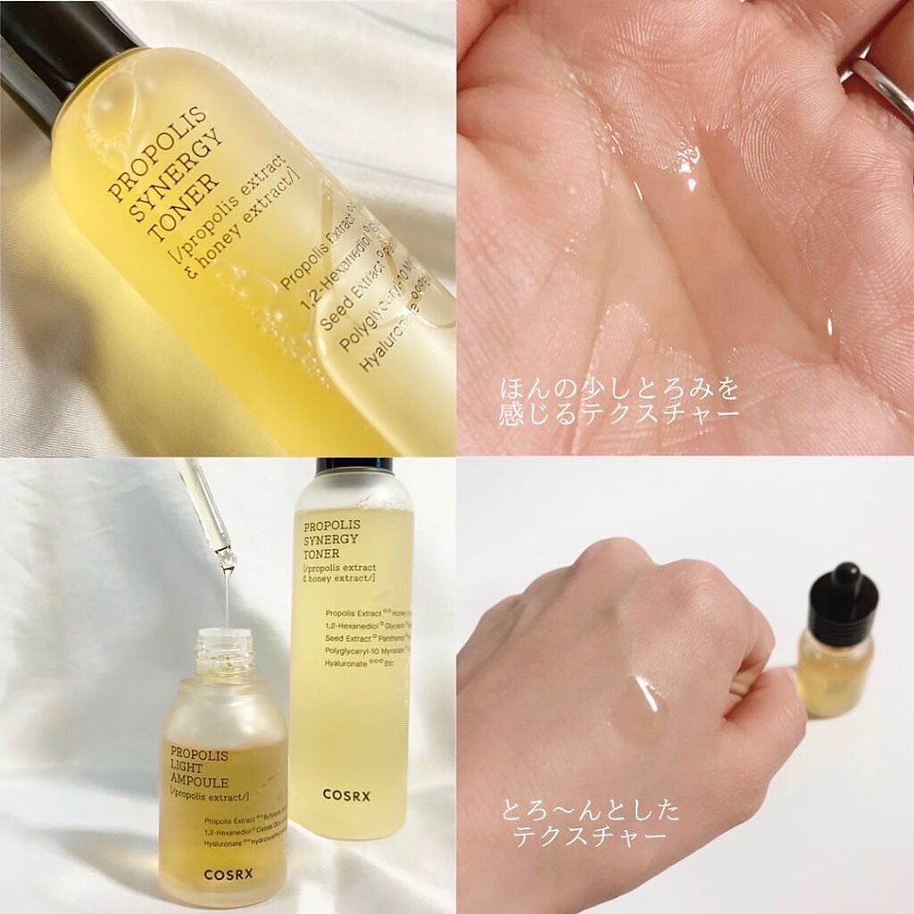 プロポリスエキスがトナー・・72.6% アンプル・・83%だそうです。 香りはほぼないです。めっちゃ使いやすい。 トナーはどっちかというとシャバシャバ系のテクスチャー。 特に化粧水はストック買いしたいと思うほどに気に入った💞