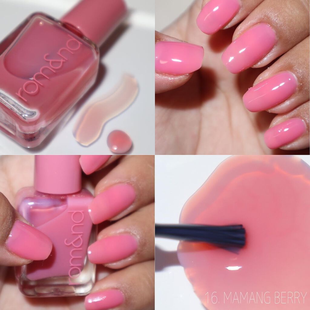 - 指先に玉石のような、ならかな光沢をとどめる。塗った瞬間から綺麗なツヤと光沢を維持し、重ねて塗っても透き通ったカラー感を鮮やかにとどめる、素早い乾燥力のナチュラルカラーネイル。「ロムアンド」の次世代型ネイルです。