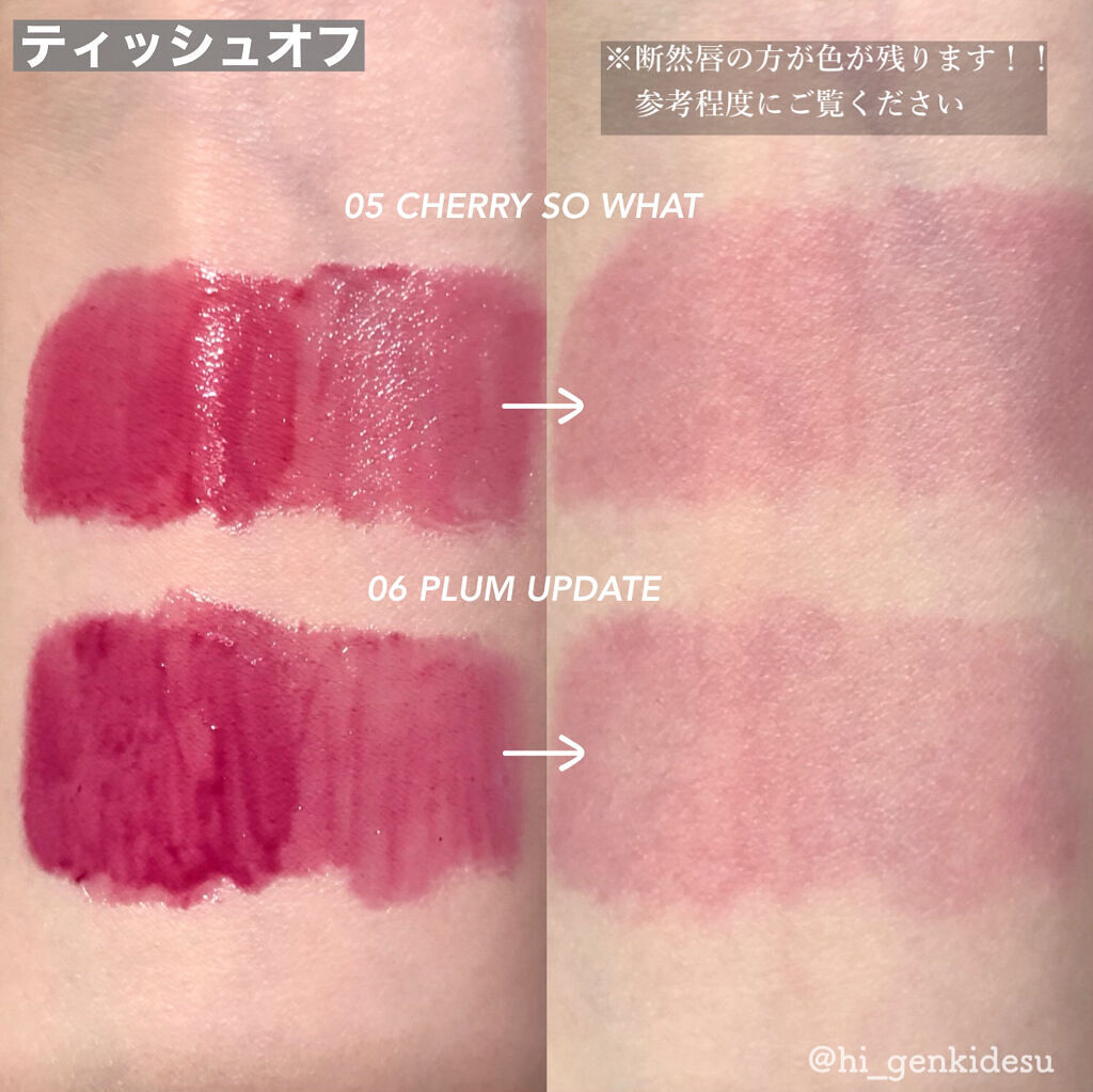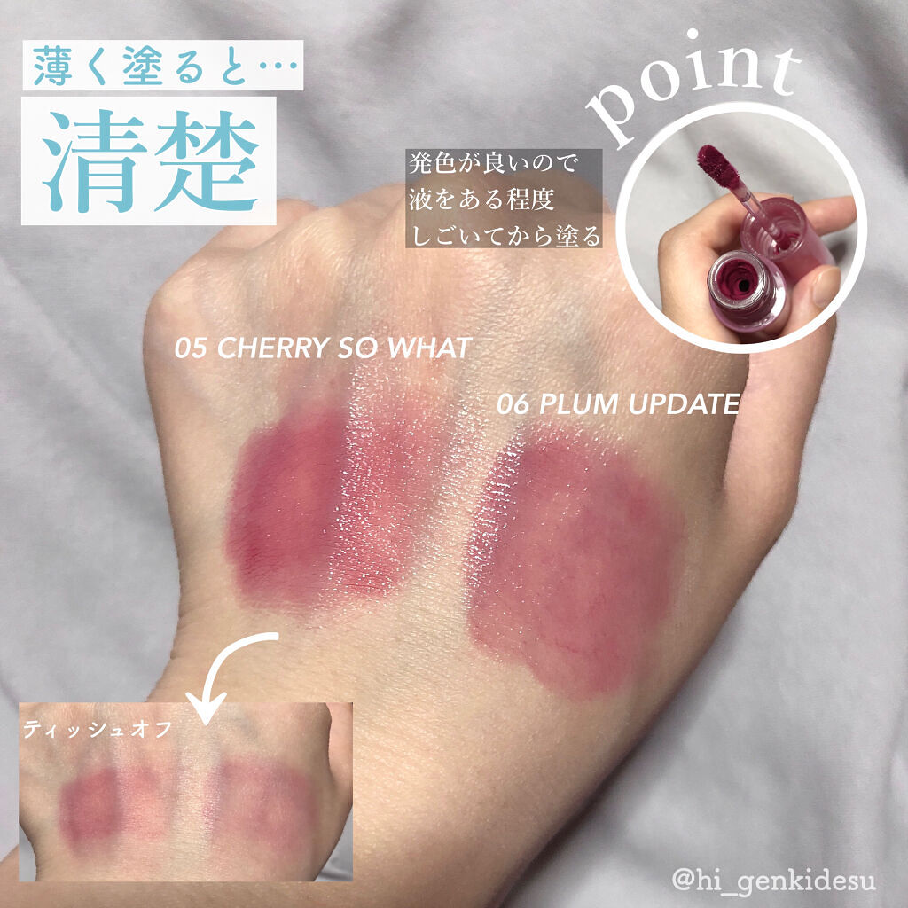 - <01 BEST BEIGE MENU(推し杏子ベージュ)> 水、ジフェニルジメチコン、リンゴ酸ジイソステアリル、ビスジグリセリルボリアシルアジペート-2、水添ポリイソブテン、ダイマー ジリノール酸ダイマージリノレイルビス(ベヘニル/イソステアリル/フィトステリル)、ジグリセリン、セチルPEG/PPG-10/1ジメチコン、DPG、水添ポリ (C6-14 オレフィン)、ポリソルベート60、イソステアリン酸ソルビタン、ダイマージリノール酸ジイソステアリン酸ポリ グリセリル-3、ペンチレングリコール、(アクリル酸ヒドロキシエチル/アクリロイルジメチルタウリンNa)コポリマー、トリ(カプリル酸/ カプリン酸)グリセリル、スクワラン、セテアレス-20、(エチレン/プロピレン)コポリマー、フェノキシエタノール、グリセリン、ポリグリ セリン-3、香料、エチルヘキシルグリセリン、ハマメリス葉エキス、オニユリエキス、BG、酸化チタン、黄5、赤227、赤104(1)、青1 <02 CORAL INFLUENCER(イエベ必須コーラル)> 水、ジフェニルジメチコン、リンゴ酸ジイソステアリル、ビスジグリセリルボリアシルアジペート-2、水添ポリイソブテン、ダイマー ジリノール酸ダイマージリノレイルビス(ベヘニル/イソステアリル/フィトステリル)、ジグリセリン、セチルPEG/PPG-10/1ジメチコン、DPG、水添ポリ (C6-14 オレフィン)、ポリソルベート60、イソステアリン酸ソルビタン、ダイマージリノール酸ジイソステアリン酸ポリ グリセリル-3、ペンチレングリコール、(アクリル酸ヒドロキシエチル/アクリロイルジメチルタウリンNa)コポリマー、トリ(カプリル酸/ カプリン酸)グリセリル、スクワラン、セテアレス-20、(エチレン/プロピレン)コポリマー、フェノキシエタノール、グリセリン、ポリグリ セリン-3、香料、エチルヘキシルグリセリン、ハマメリス葉エキス、オニユリエキス、BG、酸化チタン、黄5、赤227、赤104(1)、青1 <03 ROSE IN MIND(いいねローズ)> 水、ジフェニルジメチコン、リンゴ酸ジイソステアリル、ビスジグリセリルポリアシルアジペート-2、水添ポリイソブテン、ダイマージリノール酸ダイマージリノレイルビス(ベヘニル/イソステアリル/フィトステリル)、ジグリセリン、DPG、セチルPEG/PPG-10/1ジメチコン、水添ポリデセン、ポリソルベート60、イソステアリン酸ソルビタン、ダイマージリノール酸ジイソステアリン酸ポリグリセリル-3、ペンチレングリコール、(アクリル酸ヒドロキシエチル/アクリロイルジメチルタウリンNa)コポリマー、トリ(カプリル酸/カプリン酸)グリセリル、スクワラン、セテアレス-20、(エチレン/プロピレン)コポリマー、フェノキシエタノール、グリセリン、香料、エチルヘキシルグリセリン、ハマメリス葉エキス、オニユリエキス、BG、テトラ(ジ-t-ブチルヒドロキシヒドロケイヒ酸)ペンタエリスリチル、酸化チタン、黄5、赤104(1)、赤227、青1 <04 PINK YOUTH(ベイビー天使)> 水、ジフェニルジメチコン、リンゴ酸ジイソステアリル、ビスジグリセリルボリアシルアジペート-2、水添ポリイソブテン、ダイマー ジリノール酸ダイマージリノレイルビス(ベヘニル/イソステアリル/フィトステリル)、ジグリセリン、セチルPEG/PPG-10/1ジメチコン、DPG、水添ポリ (C6-14オレフィン)、ポリソルベート60、イソステアリン酸ソルビタン、ダイマージリノール酸ジイソステアリン酸ポリ グリセリル-3、ペンチレングリコール、(アクリル酸ヒドロキシエチル/アクリロイルジメチルタウリンNa)コポリマー、トリ(カプリル酸/ カプリン酸)グリセリル、スクワラン、セテアレス-20、(エチレン/プロピレン)コポリマー、フェノキシエタノール、ポリグリセリン-3、香料、エチルヘキシルグリセリン、グリセリン、水酸化Al、ポリアクリル酸アンモニウム、BG、ハマメリス葉エキス、オニユリエキス、酸化チタン、赤227、黄4、赤104 (1) 黄5、青1 <05 CHERRY SO WHAT(どうしたのチェリー)> 水、ジフェニルジメチコン、リンゴ酸ジイソステアリル、ビスジグリセリルポリアシルアジペート-2、水添ポリイソブテン、ダイマージリノール酸ダイマージリノレイルビス(ベヘニル/イソステアリル/フィトステリル)、ジグリセリン、セチルPEG/PPG-10/1ジメチコン、DPG、水添ポリ(C6-14オレフィン)、ポリソルベート60、イソステアリン酸ソルビタン、ダイマージリノール酸ジイソステアリン酸ポリグリセリル-3、ペンチレングリコール、(アクリル酸ヒドロキシエチル/アクリロイルジメチルタウリンNa)コポリマー、トリ(カプリル酸/カプリン酸)グリセリル、スクワラン、セテアレス-20、(エチレン/プロピレン)コポリマー、フェノキシエタノール、ポリグリセリン-3、香料、エチルヘキシルグリセリン、グリセリン、ハマメリス葉エキス、オニユリエキス、BG、赤227、黄4、赤104(1)、黄5、青1 <06 PLUM UPDATE(プロフ写プラム)> 水、ジフェニルジメチコン、リンゴ酸ジイソステアリル、ビスジグリセリルポリアシルアジペート-2、水添ポリイソブテン、ダイマー ジリノール酸ダイマージリノレイルビス(ベヘニル/イソステアリル/フィトステリル)、