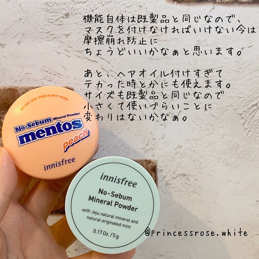 - 期間・数量限定発売 世界中で親しまれているグローバルキャンディーブランド「メントス」とのコラボレーションが実現 「ノーセバム ミネラルパウダー」は使う人の肌を、「メントス」は食べた人の気分をともにリフレッシュさせるという共通イメージのもと、まるで「メントス」のキャンディーのようなキュートなパッケージとジューシーな香りで6種類展開いたします。 ■今だけ!メントスをイメージしたパッケージ&香り イニスフリーで大人気のノーセバム ミネラルパウダーと、みんなが大好きなキャンディー 「メントス」がコラボレーション。まるでメントスキャンディーのようなキュートなパッケージとジューシーな香りで6種類展開です。 ■さらさら肌を保つ皮脂コントロールパウダー 皮脂吸着パウダー*1とミネラル皮脂コントロールパウダー*2が過剰な皮脂を吸着し、メイクしたてのようなさらさらマットな肌を演出します。 ■チェジュ島の天然ミネラル*3とミント*4配合 チェジュ島の天然ミネラル*3とミント*4を配合し、肌の油・水分のバランスを整え、また、爽やかな使用感を与えます。 ■余分な皮脂を吸着して肌トーンを補正 肌のくすみで数ある原因の1つが余分な皮脂。この余分な皮脂を吸着することで肌をワントーン明るく補正*5。1日中明るくさわやかな肌を演出します。 *1 変性コーンスターチ、(ジメチコン/ビニルジメチコン)クロスポリマー、マイカ *2 シリカ、マイカ *3 ミネラル塩(整肌成分) *4 メンタアルベンシス葉エキス(整肌成分) *5 メイクアップ効果