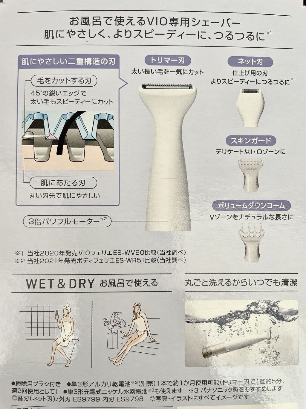 - VIO専用シェーバーで肌にやさしく、かんたん、自宅でケア。 ①VIO専用刃のトリマー刃は二重構造のなので、肌へのやさしさと鋭いカット性能を両立 →毛をカットする刃は45°の鋭いエッジで太い毛も巻き込まず、スパっとカット。 →肌にあたる方の刃は丸い刃先なのでソフトな肌あたりを実現。強く押しあてても奥まで食い込みづらいので肌を傷つけにくい。 ➁ツルツルに仕上げる為の「ネット刃」が進化、より※1スピーディーにツルツルに →ネット刃の、肌にあたる面積が2倍になり、処理スピードが上がり、お手入れ時間が短縮できる様に。 →より毛を捉えやすい幅広間口に進化する事で、仕上がりのツルツル感アップ※1 ※1 当社従来品2020年発売ES-WV60との比較(当社調べ) ③付属のアタッチメント「ボリュームダウンコーム」を使えば、Vゾーンをナチュラルな長さに整えられる →ボリュームダウンコームを使用すると、毛にそってなでるだけで毛の高さを揃えて、お好みのVゾーンへ ④防水仕様(IPX7基準※2)だからお風呂でケア可能 ※2 IPX7基準(水深1メートルに30分間水に浸けても有害な影響を生じる量の水の浸入がない)検査をクリアしています。 *濡れると毛が寝てしまうので、毛が乾いた状態でのご使用をおすすめします。 ・脱毛サロンやクリニックに通っている方は、施術前のプレシェーブ(おうちでの自己処理)にもピッタリの、使い勝手が良い商品です。 ・VIOの毛には生理の経血や排せつ物がつきやすく、においが発生したり、ムレたりします。VIOの毛を処理して、デリケートゾーンを清潔に保つことがおすすめです。