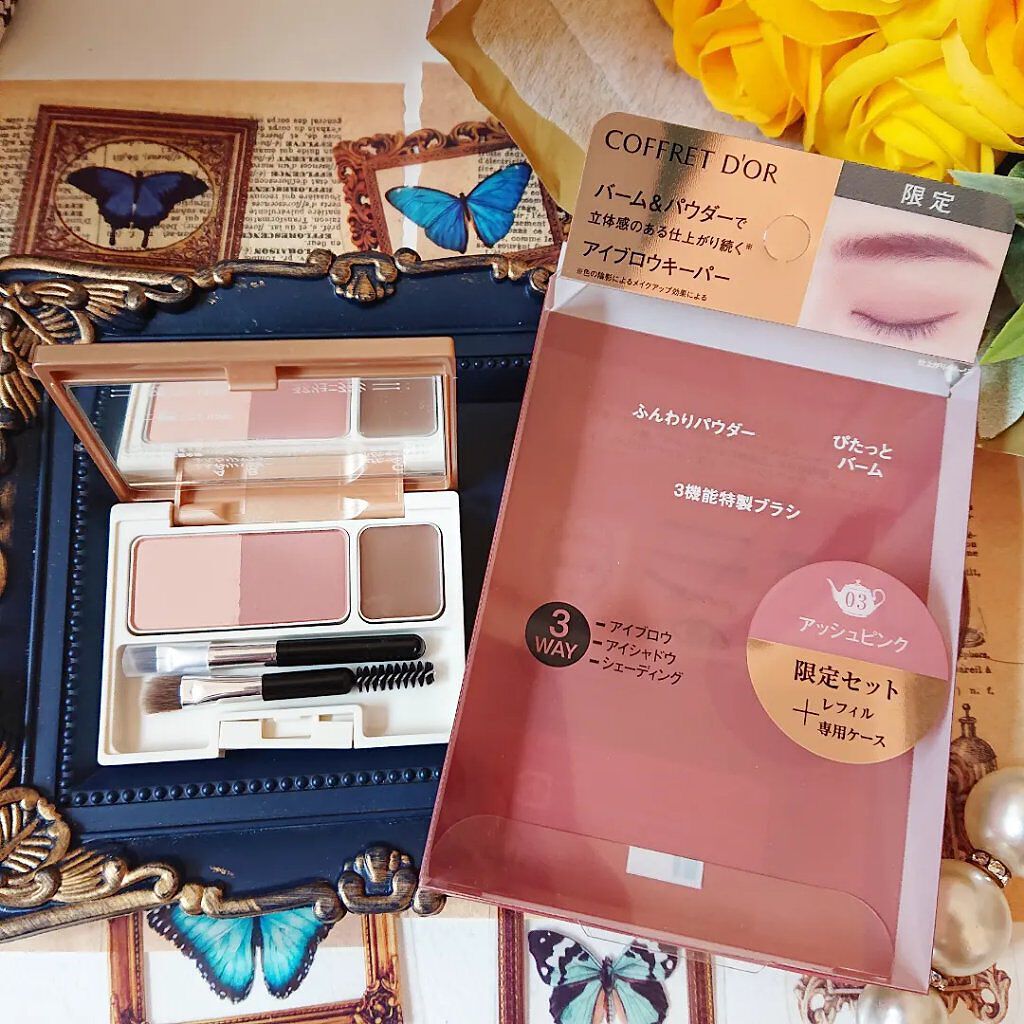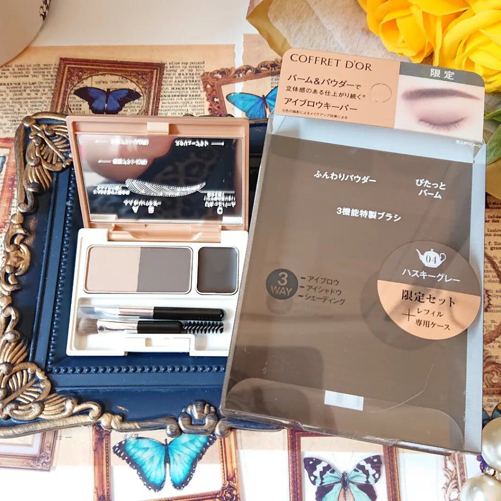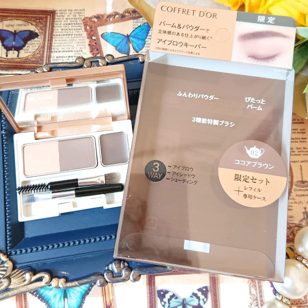 - ぴたっとバームとふんわりパウダーで眉の毛流れ、立体感のある仕上がり※、続くシェーディングやアイシャドウにも使えるアイブロウパレット ※色の陰影によるメイクアップ効果による ぴたっと密着バーム&ふんわり定着パウダーの合わせ使いで、汗・マスク着用時の蒸気にも対応し、毛が生えていない部分も消えにくい、ウォータープルーフタイプ。 ● バームとパウダーの質感の使い分けで、より精密な毛流れや影を表現。 ● シェーディングやアイシャドウまで、顔中使えるマルチタイプ。 ● 使い心地にもこだわった特製ブラシ付き。 コフレドール アイブロウキーパー 全4 種 3.0g こちらの商品は詰め替え用〈レフィル〉です。別売りのアイブロウキーパー用ケースにセットしてお使いください。 アイブロウキーパー用ケース1種(税込770円 ※編集部調べ) 01メルティブラウン(ライトブラウン系) 02ココアブラウン(ブラウン系) 03アッシュピンク(ピンク系) 04ハスキーグレー(グレー系) <数量限定:初回限定版> シェーディングやアイシャドウにも使えるマルチタイプで、絶妙なニュアンスカラーを揃えたウォータープルーフタイプのアイブロウパレットのレフィルにケースがついた便利なセット。 セット内容 コフレドール アイブロウキーパー3.0ℊ(現品) コフレドール アイブロウキーパー用ケース(現品)