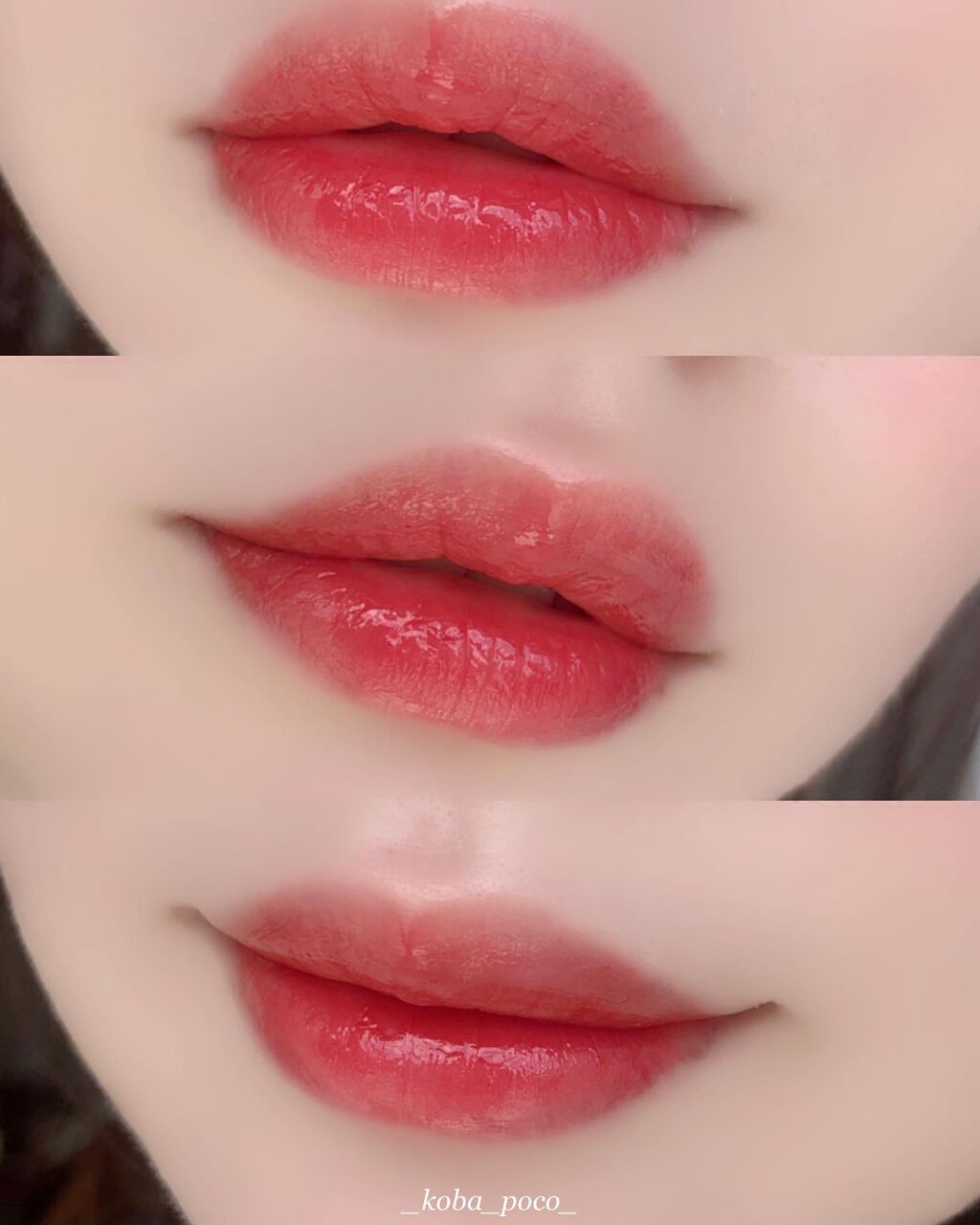 - みずみずしいフルーツがきらめくようなシロップティント ①なめらかで潤いのあるリップを実現 ②果汁のシロップのようなカラー感 ③時間が経つにつれ凸凹を滑らかに密着しボリューム感を演出