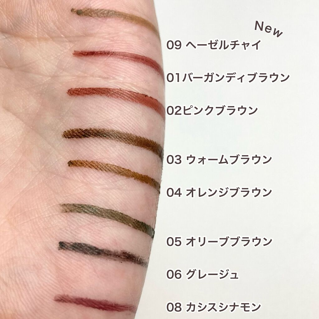- <02 ピンクブラウン> トリメチルシロキシケイ酸、メチルトリメチコン、ポリエチレン、(アクリレーツ/アクリル酸ステアリル/メタクリル酸ジメチコン)コポリマー、カルナウバロウ、キャンデリラロウ、スクワラン、ホホバ種子油、トリイソステアリン酸ポリグリセリル-2、水酸化Al、ジメチコン、トコフェロール、酸化鉄、酸化チタン、マイカ、グンジョウ <03 ウォームブラウン> トリメチルシロキシケイ酸、メチルトリメチコン、ポリエチレン、(アクリレーツ/アクリル酸ステアリル/メタクリル酸ジメチコン)コポリマー、カルナウバロウ、キャンデリラロウ、スクワラン、ホホバ種子油、トリイソステアリン酸ポリグリセリル-2、ジメチコン、トコフェロール、水酸化Al、酸化鉄、マイカ、酸化チタン、グンジョウ <04 オレンジブラウン> トリメチルシロキシケイ酸、メチルトリメチコン、ポリエチレン、(アクリレーツ/アクリル酸ステアリル/メタクリル酸ジメチコン)コポリマー、カルナウバロウ、キャンデリラロウ、スクワラン、ホホバ種子油、トリイソステアリン酸ポリグリセリル-2、ジメチコン、水酸化Al、トコフェロール、酸化鉄、グンジョウ、マイカ、酸化チタン <06 グレージュ> トリメチルシロキシケイ酸、メチルトリメチコン、ポリエチレン、(アクリレーツ/アクリル酸ステアリル/メタクリル酸ジメチコン)コポリマー、カルナウバロウ、キャンデリラロウ、スクワラン、ホホバ種子油、トリイソステアリン酸ポリグリセリル-2、水酸化Al、ジメチコン、トコフェロール、酸化鉄、酸化チタン、マイカ、グンジョウ <09 ヘーゼルチャイ> イソドデカン、トリメチルシロキシケイ酸、合成ワックス、(アクリレーツ/アクリル酸ステアリル/メタクリル酸ジメチコン)コポリマー、カルナウバロウ、ジフェニルシロキシフェニルトリメチコン、スクワラン、ホホバ種子油、ジメチコン、水酸化Al、トコフェロール、酸化鉄、酸化チタン、マイカ、グンジョウ <18 アプリコットブラウン> イソドデカン、トリメチルシロキシケイ酸、合成ワックス、(アクリレーツ/アクリル酸ステアリル/メタクリル酸ジメチコン)コポリマー、カルナウバロウ、ジフェニルシロキシフェニルトリメチコン、ホウケイ酸(Ca/Al)、スクワラン、ホホバ種子油、ジメチコン、水酸化Al、トコフェロール、酸化スズ、酸化鉄、マイカ、酸化チタン、グンジョウ <19 インディゴブラック> イソドデカン、トリメチルシロキシケイ酸、合成ワックス、(アクリレーツ/アクリル酸ステアリル/メタクリル酸ジメチコン)コポリマー、カルナウバロウ、ジフェニルシロキシフェニルトリメチコン、ジメチコン、トコフェロール、スクワラン、ホホバ種子油、水酸化Al、酸化鉄、マイカ、グンジョウ、酸化チタン、ホウケイ酸(Ca/Al)、酸化スズ <01 バーガンディブラウン> トリメチルシロキシケイ酸、メチルトリメチコン、ポリエチレン、(アクリレーツ/アクリル酸ステアリル/メタクリル酸ジメチコン)コポリマー、カルナウバロウ、キャンデリラロウ、スクワラン、ホホバ種子油、トリイソステアリン酸ポリグリセリル-2、水酸化Al、ジメチコン、トコフェロール、酸化鉄、グンジョウ、酸化チタン、マイカ <05 オリーブブラウン> トリメチルシロキシケイ酸、メチルトリメチコン、ポリエチレン、(アクリレーツ/アクリル酸ステアリル/メタクリル酸ジメチコン)コポリマー、カルナウバロウ、キャンデリラロウ、スクワラン、ホホバ種子油、トリイソステアリン酸ポリグリセリル-2、ジメチコン、トコフェロール、水酸化Al、酸化鉄、グンジョウ、マイカ、酸化チタン <08 カシスシナモン> カシスシナモン トリメチルシロキシケイ酸、メチルトリメチコン、ポリエチレン、(アクリレーツ/アクリル酸ステアリル/メタクリル酸ジメチコン)コポリマー、カルナウバロウ、キャンデリラロウ、スクワラン、ホホバ種子油、トリイソステアリン酸ポリグリセリル-2、水酸化Al、ジメチコン、トコフェロール、酸化鉄、グンジョウ、酸化チタン、マイカ <10 ピスタチオキャメル> トリメチルシロキシケイ酸、メチルトリメチコン、ポリエチレン、(アクリレーツ/アクリル酸ステアリル/メタクリル酸ジメチコン)コポリマー、カルナウバロウ、トリイソステアリン酸ポリグリセリル-2、キャンデリラロウ、スクワラン、ホホバ種子油、ジメチコン、水酸化Al、トコフェロール、マイカ、酸化鉄、酸化チタン、グンジョウ、コンジョウ <11 ロゼウッド> トリメチルシロキシケイ酸、メチルトリメチコン、ポリエチレン、(アクリレーツ/アクリル酸ステアリル/メタクリル酸ジメチコン)コポリマー、カルナウバロウ、トリイソステアリン酸ポリグリセリル-2、キャンデリラロウ、スクワラン、ホホバ種子油、ジメチコン、水酸化Al、トコフェロール、マイカ、酸化鉄、酸化チタン <13 ミモザブラウン> トリメチルシロキシケイ酸、メチルトリメチコン、合成ワックス、(アクリレーツ/アクリル酸ステアリル/メタクリル酸ジメチコン)コ