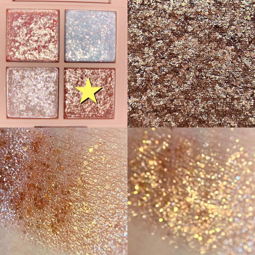 うん、やっぱ可愛い!♡ 神配色👏🏻 今の時期より夏に登場頻度増えそう🙌 ギラギラゴールドがタイプすぎる♡ 左:イエローゴールドシマー ⇒コッパーとゴールドのラメがたっぷり! 大粒ラメがギラギラ夏っぽい 右:シマリングライトピーチ ⇒発色は薄いもののベースや涙袋にだ活躍してくれる ピンクベージュ 左:オレンジ&ゴールデンシマー ⇒ありそうでなかったオレンジカラー オレンジからのゴールドの偏光がたまらない🍊 右:マットパープルレッド ⇒かなり濃いめのパープル!オレンジメイクにアクセントと深みを出してくれる
