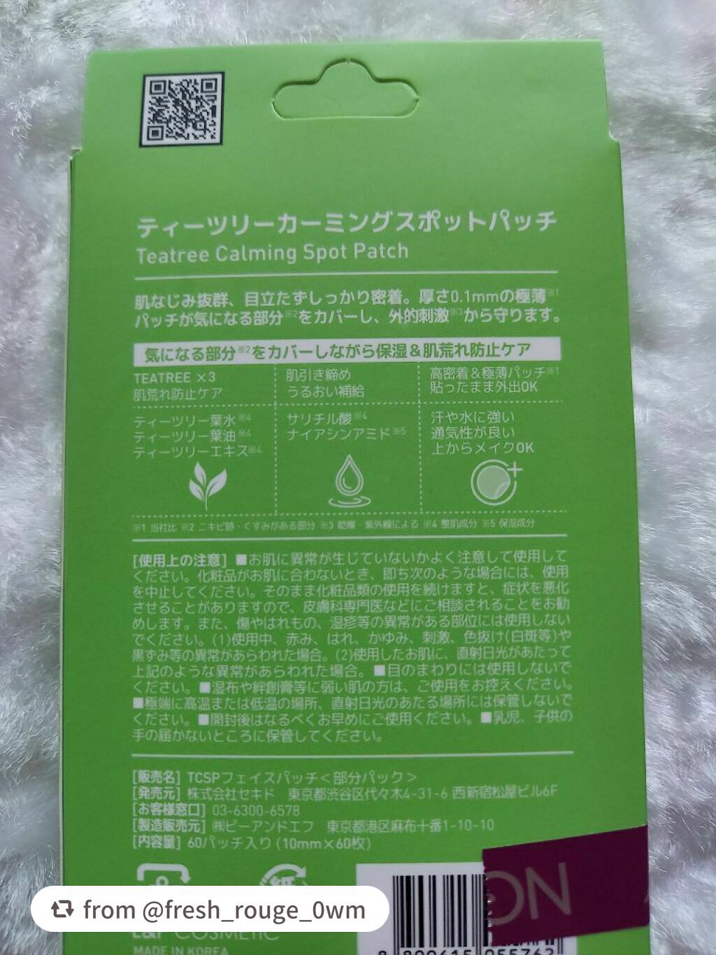 - <ティーツリーカーミングスポットパッチ> アクリレーツコポリマー、サリチル酸、ティーツリー葉油、ティーツリーエキス、ティーツリー葉水、ナイアシンアミド、1,2-ヘキサンジオール