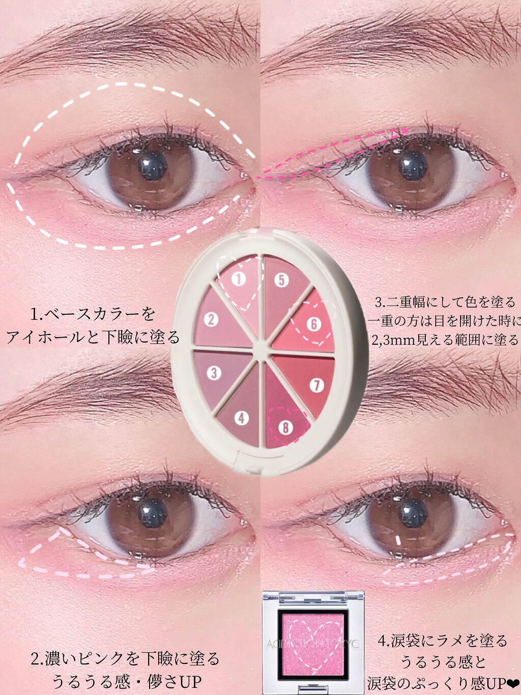 アイライナーはピンクや赤などの色を使用することで擬似粘膜っぽい仕上がりになり蒙古襞が気にならなくなります✨ 蒙古襞の内側は濃く太く塗っても大丈夫ですが普通にしてても見える部分は細めに目の形に沿って塗るのが自然に仕上がるポイントです🎀 長さはワンホンの方だと地雷盛りラインに繋げて描く方もいらっしゃいますが慣れるまでは蒙古襞と黒目の端の中間くらいまでを目安に塗るといいと思います🌸