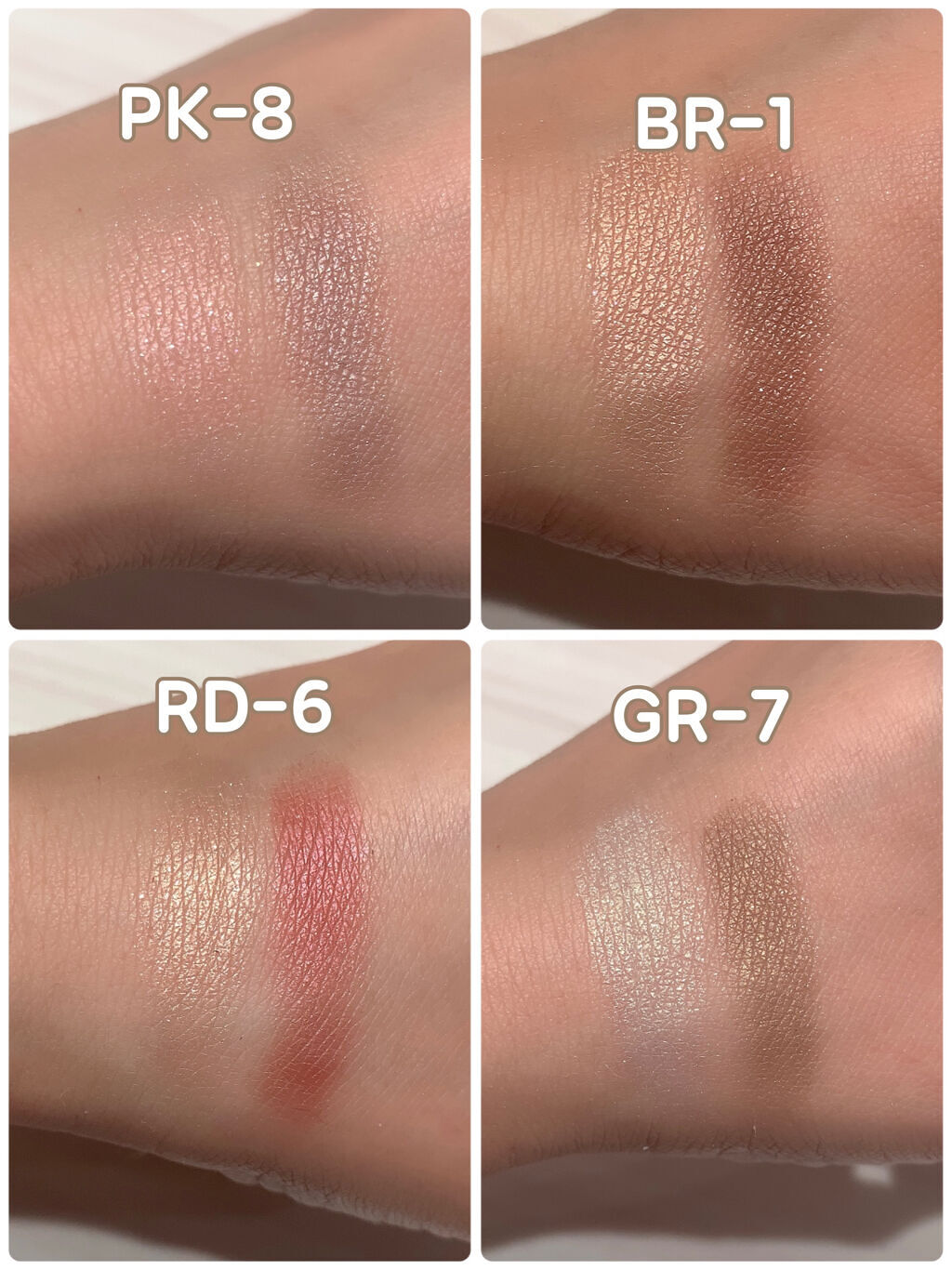 - <BE-2 ベージュ系> タルク、ナイロン-12、ミネラルオイル、メタクリル酸メチルクロスポリマー、合成金雲母、ホウケイ酸 (Ca/Al) 、クオタニウム-18ヘクトライト、 (PEG-15/ラウリルジメチコン) クロスポリマー、トコフェロール、ヒアルロン酸Na、BG、BHT、DPG、PVP、アモジメチコン、イソドデカン、クエン酸Na、グリセリン、セスキイソステアリン酸ソルビタン、トリエトキシカプリリルシラン、ハイドロゲンジメチコン、ポリブテン、ラウリン酸亜鉛、酸化スズ、グンジョウ、マイカ、酸化チタン、酸化亜鉛、酸化鉄 <BL-4 ネイビーブロンズ系> タルク、ミネラルオイル、ナイロン-12、メタクリル酸メチルクロスポリマー、合成金雲母、クオタニウム-18ヘクトライト、 (PEG-15/ラウリルジメチコン) クロスポリマー、トコフェロール、ヒアルロン酸Na、BG、BHT、DPG、PVP、アミノプロピルトリエトキシシラン、アモジメチコン、イソドデカン、クエン酸Na、グリセリン、ジメチコノール、セスキイソステアリン酸ソルビタン、トリエトキシカプリリルシラン、ハイドロゲンジメチコン、ポリブテン、酸化スズ、水酸化Al、グンジョウ、コンジョウ、マイカ、酸化チタン、酸化亜鉛、酸化鉄、硫酸Ba、赤226 <BR-1 ピンクブラウン系> タルク、ナイロン-12、ミネラルオイル、メタクリル酸メチルクロスポリマー、ホウケイ酸 (Ca/Al) 、合成金雲母、クオタニウム-18ヘクトライト、 (PEG-15/ラウリルジメチコン) クロスポリマー、トコフェロール、ヒアルロン酸Na、BG、BHT、DPG、PVP、アモジメチコン、イソドデカン、クエン酸Na、グリセリン、セスキイソステアリン酸ソルビタン、トリエトキシカプリリルシラン、ハイドロゲンジメチコン、ポリブテン、酸化スズ、 (PET/ポリメタクリル酸メチル) ラミネート、グンジョウ、マイカ、酸化チタン、酸化亜鉛、酸化鉄、赤226 <GR-7 ミントカーキ系> 合成金雲母、タルク、ナイロン-12、ミネラルオイル、メタクリル酸メチルクロスポリマー、クオタニウム-18ヘクトライト、 (PEG-15/ラウリルジメチコン) クロスポリマー、グリセリン、トコフェロール、ヒアルロン酸Na、BG、BHT、DPG、PVP、イソドデカン、クエン酸Na、セスキイソステアリン酸ソルビタン、トリエトキシカプリリルシラン、ハイドロゲンジメチコン、ポリブテン、酸化スズ、グンジョウ、コンジョウ、マイカ、酸化チタン、酸化亜鉛、酸化鉄、硫酸Ba、黄4 <OR-3 テラコッタゴールド系> タルク、合成金雲母、ナイロン-12、ミネラルオイル、メタクリル酸メチルクロスポリマー、クオタニウム-18ヘクトライト、 (PEG-15/ラウリルジメチコン) クロスポリマー、トコフェロール、ヒアルロン酸Na、BG、BHT、DPG、PVP、アモジメチコン、イソドデカン、クエン酸Na、グリセリン、セスキイソステアリン酸ソルビタン、トリエトキシカプリリルシラン、ハイドロゲンジメチコン、ポリブテン、酸化スズ、グンジョウ、マイカ、酸化チタン、酸化亜鉛、酸化鉄、赤226 <PK-8 グレイッシュピンク系> タルク、ナイロン-12、ミネラルオイル、合成金雲母、メタクリル酸メチルクロスポリマー、ホウケイ酸 (Ca/Al) 、クオタニウム-18ヘクトライト、 (PEG-15/ラウリルジメチコン) クロスポリマー、グリセリン、トコフェロール、ヒアルロン酸Na、BG、BHT、DPG、PVP、アモジメチコン、イソドデカン、クエン酸Na、セスキイソステアリン酸ソルビタン、トリエトキシカプリリルシラン、ハイドロゲンジメチコン、ポリブテン、酸化スズ、 (PET/ポリメタクリル酸メチル) ラミネート、グンジョウ、マイカ、酸化チタン、酸化亜鉛、酸化鉄、赤226 <PU-5 モーヴブラウン系> タルク、ナイロン-12、ミネラルオイル、メタクリル酸メチルクロスポリマー、合成金雲母、トコフェロール、ヒアルロン酸Na、BG、BHT、DPG、PVP、 (PEG-15/ラウリルジメチコン) クロスポリマー、アモジメチコン、イソドデカン、クエン酸Na、クオタニウム-18ヘクトライト、グリセリン、セスキイソステアリン酸ソルビタン、トリエトキシカプリリルシラン、ハイドロゲンジメチコン、ホウケイ酸 (Ca/Al) 、ポリブテン、酸化スズ、グンジョウ、マイカ、酸化チタン、酸化亜鉛、酸化鉄 <RD-6 ベージュレッド系> タルク、合成金雲母、ナイロン-12、ミネラルオイル、メタクリル酸メチルクロスポリマー、クオタニウム-18ヘクトライト、 (PEG-15/ラウリルジメチコン) クロスポリマー、グリセリン、トコフェロール、ヒアルロン酸Na、BG、BHT、DPG、PVP、アモジメチコン、イソドデカン、クエン酸Na、セスキイソステアリン酸ソルビタン、トリエトキシカプリリルシラン、ハイドロゲンジメチコン、ポリブテン、酸化スズ、グンジョウ、マイカ、酸化チタン、酸化亜鉛、酸化鉄、赤202