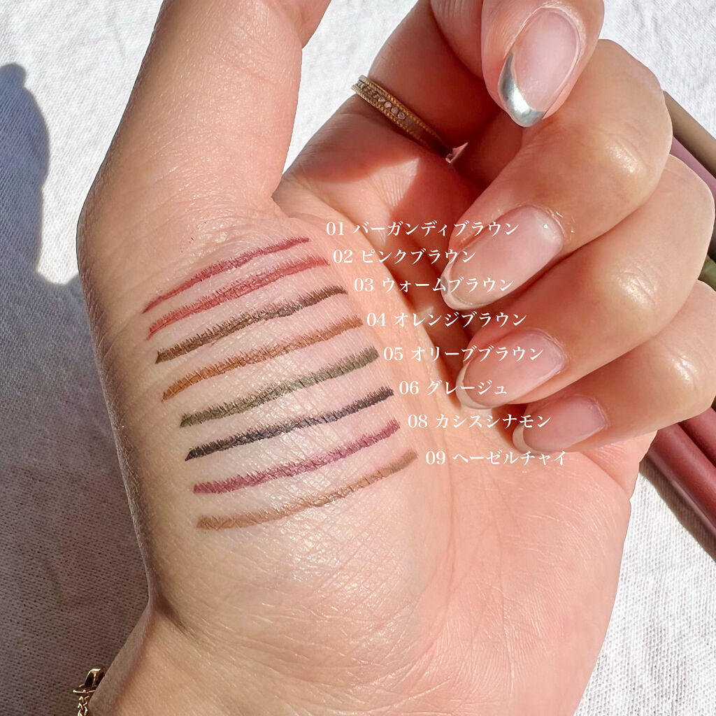 - <02 ピンクブラウン> トリメチルシロキシケイ酸、メチルトリメチコン、ポリエチレン、(アクリレーツ/アクリル酸ステアリル/メタクリル酸ジメチコン)コポリマー、カルナウバロウ、キャンデリラロウ、スクワラン、ホホバ種子油、トリイソステアリン酸ポリグリセリル-2、水酸化Al、ジメチコン、トコフェロール、酸化鉄、酸化チタン、マイカ、グンジョウ <03 ウォームブラウン> トリメチルシロキシケイ酸、メチルトリメチコン、ポリエチレン、(アクリレーツ/アクリル酸ステアリル/メタクリル酸ジメチコン)コポリマー、カルナウバロウ、キャンデリラロウ、スクワラン、ホホバ種子油、トリイソステアリン酸ポリグリセリル-2、ジメチコン、トコフェロール、水酸化Al、酸化鉄、マイカ、酸化チタン、グンジョウ <04 オレンジブラウン> トリメチルシロキシケイ酸、メチルトリメチコン、ポリエチレン、(アクリレーツ/アクリル酸ステアリル/メタクリル酸ジメチコン)コポリマー、カルナウバロウ、キャンデリラロウ、スクワラン、ホホバ種子油、トリイソステアリン酸ポリグリセリル-2、ジメチコン、水酸化Al、トコフェロール、酸化鉄、グンジョウ、マイカ、酸化チタン <06 グレージュ> トリメチルシロキシケイ酸、メチルトリメチコン、ポリエチレン、(アクリレーツ/アクリル酸ステアリル/メタクリル酸ジメチコン)コポリマー、カルナウバロウ、キャンデリラロウ、スクワラン、ホホバ種子油、トリイソステアリン酸ポリグリセリル-2、水酸化Al、ジメチコン、トコフェロール、酸化鉄、酸化チタン、マイカ、グンジョウ <09 ヘーゼルチャイ> イソドデカン、トリメチルシロキシケイ酸、合成ワックス、(アクリレーツ/アクリル酸ステアリル/メタクリル酸ジメチコン)コポリマー、カルナウバロウ、ジフェニルシロキシフェニルトリメチコン、スクワラン、ホホバ種子油、ジメチコン、水酸化Al、トコフェロール、酸化鉄、酸化チタン、マイカ、グンジョウ <18 アプリコットブラウン> イソドデカン、トリメチルシロキシケイ酸、合成ワックス、(アクリレーツ/アクリル酸ステアリル/メタクリル酸ジメチコン)コポリマー、カルナウバロウ、ジフェニルシロキシフェニルトリメチコン、ホウケイ酸(Ca/Al)、スクワラン、ホホバ種子油、ジメチコン、水酸化Al、トコフェロール、酸化スズ、酸化鉄、マイカ、酸化チタン、グンジョウ <19 インディゴブラック> イソドデカン、トリメチルシロキシケイ酸、合成ワックス、(アクリレーツ/アクリル酸ステアリル/メタクリル酸ジメチコン)コポリマー、カルナウバロウ、ジフェニルシロキシフェニルトリメチコン、ジメチコン、トコフェロール、スクワラン、ホホバ種子油、水酸化Al、酸化鉄、マイカ、グンジョウ、酸化チタン、ホウケイ酸(Ca/Al)、酸化スズ <01 バーガンディブラウン> トリメチルシロキシケイ酸、メチルトリメチコン、ポリエチレン、(アクリレーツ/アクリル酸ステアリル/メタクリル酸ジメチコン)コポリマー、カルナウバロウ、キャンデリラロウ、スクワラン、ホホバ種子油、トリイソステアリン酸ポリグリセリル-2、水酸化Al、ジメチコン、トコフェロール、酸化鉄、グンジョウ、酸化チタン、マイカ <05 オリーブブラウン> トリメチルシロキシケイ酸、メチルトリメチコン、ポリエチレン、(アクリレーツ/アクリル酸ステアリル/メタクリル酸ジメチコン)コポリマー、カルナウバロウ、キャンデリラロウ、スクワラン、ホホバ種子油、トリイソステアリン酸ポリグリセリル-2、ジメチコン、トコフェロール、水酸化Al、酸化鉄、グンジョウ、マイカ、酸化チタン <08 カシスシナモン> カシスシナモン トリメチルシロキシケイ酸、メチルトリメチコン、ポリエチレン、(アクリレーツ/アクリル酸ステアリル/メタクリル酸ジメチコン)コポリマー、カルナウバロウ、キャンデリラロウ、スクワラン、ホホバ種子油、トリイソステアリン酸ポリグリセリル-2、水酸化Al、ジメチコン、トコフェロール、酸化鉄、グンジョウ、酸化チタン、マイカ <10 ピスタチオキャメル> トリメチルシロキシケイ酸、メチルトリメチコン、ポリエチレン、(アクリレーツ/アクリル酸ステアリル/メタクリル酸ジメチコン)コポリマー、カルナウバロウ、トリイソステアリン酸ポリグリセリル-2、キャンデリラロウ、スクワラン、ホホバ種子油、ジメチコン、水酸化Al、トコフェロール、マイカ、酸化鉄、酸化チタン、グンジョウ、コンジョウ <11 ロゼウッド> トリメチルシロキシケイ酸、メチルトリメチコン、ポリエチレン、(アクリレーツ/アクリル酸ステアリル/メタクリル酸ジメチコン)コポリマー、カルナウバロウ、トリイソステアリン酸ポリグリセリル-2、キャンデリラロウ、スクワラン、ホホバ種子油、ジメチコン、水酸化Al、トコフェロール、マイカ、酸化鉄、酸化チタン <13 ミモザブラウン> トリメチルシロキシケイ酸、メチルトリメチコン、合成ワックス、(アクリレーツ/アクリル酸ステアリル/メタクリル酸ジメチコン)コ