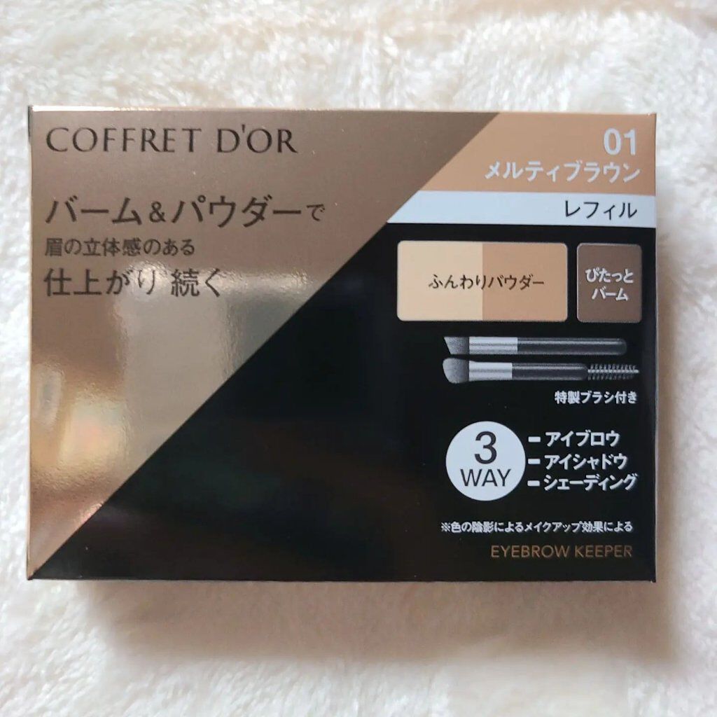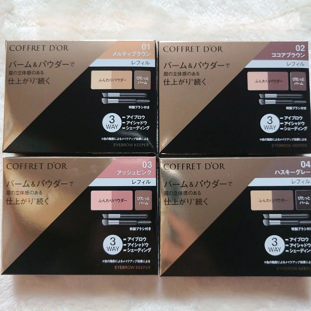- ぴたっとバームとふんわりパウダーで眉の毛流れ、立体感のある仕上がり※、続くシェーディングやアイシャドウにも使えるアイブロウパレット ※色の陰影によるメイクアップ効果による ぴたっと密着バーム&ふんわり定着パウダーの合わせ使いで、汗・マスク着用時の蒸気にも対応し、毛が生えていない部分も消えにくい、ウォータープルーフタイプ。 ● バームとパウダーの質感の使い分けで、より精密な毛流れや影を表現。 ● シェーディングやアイシャドウまで、顔中使えるマルチタイプ。 ● 使い心地にもこだわった特製ブラシ付き。 コフレドール アイブロウキーパー 全4 種 3.0g こちらの商品は詰め替え用〈レフィル〉です。別売りのアイブロウキーパー用ケースにセットしてお使いください。 アイブロウキーパー用ケース1種(税込770円 ※編集部調べ) 01メルティブラウン(ライトブラウン系) 02ココアブラウン(ブラウン系) 03アッシュピンク(ピンク系) 04ハスキーグレー(グレー系) <数量限定:初回限定版> シェーディングやアイシャドウにも使えるマルチタイプで、絶妙なニュアンスカラーを揃えたウォータープルーフタイプのアイブロウパレットのレフィルにケースがついた便利なセット。 セット内容 コフレドール アイブロウキーパー3.0ℊ(現品) コフレドール アイブロウキーパー用ケース(現品)