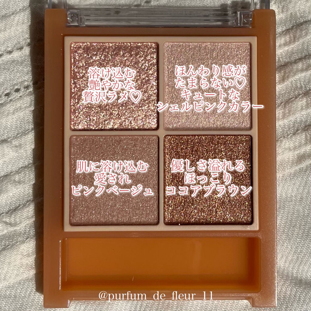 - ラメ・パール・マット3質感の4色アイシャドウ。 肌馴染みの良いベージュを基調としたカラー。ラメ・パール・マットの3質感を重ねて、自然にまぶたを強調し奥行のある大きな目元へ。 しっとり溶け込むような柔らかなパウダーなので、スルスル伸びてまぶたにピタッと密着。保湿成分(スクワラン・ホホバ種子油)配合。