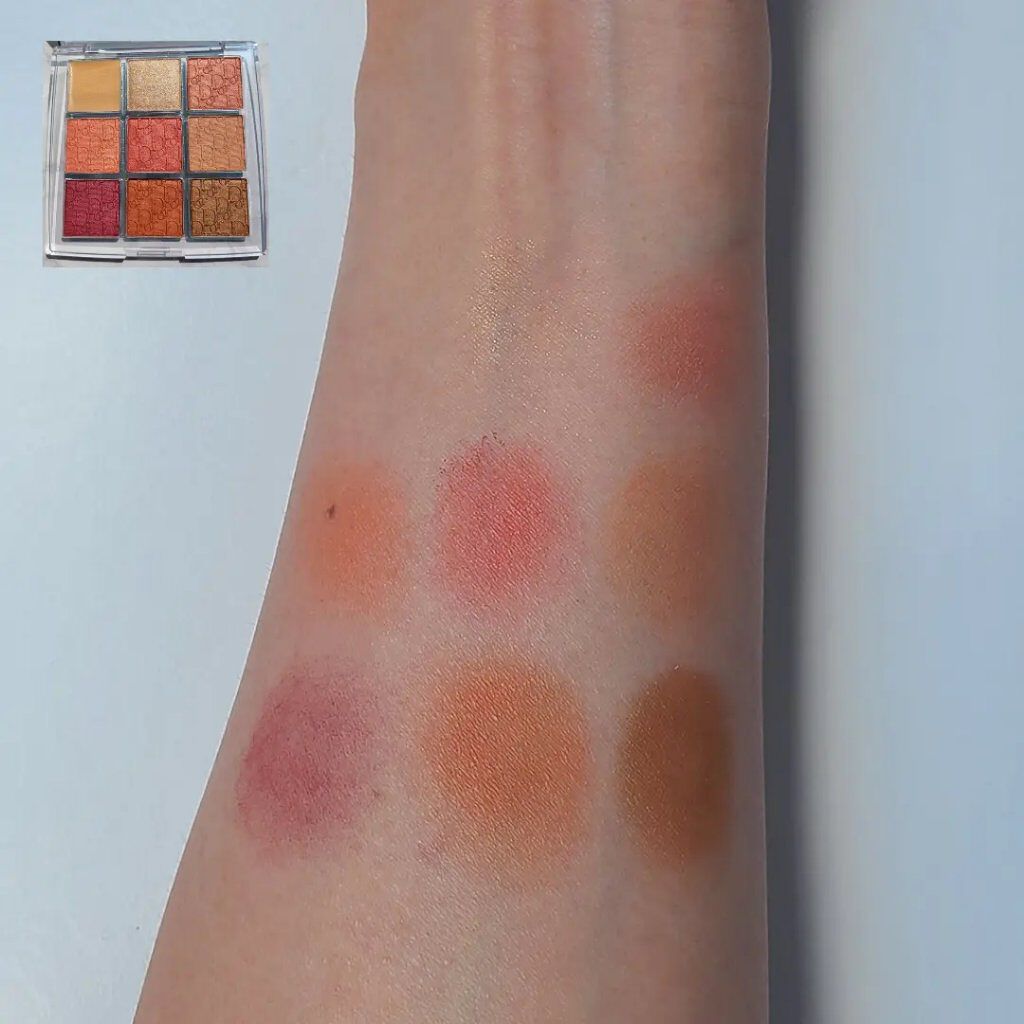 使いやすそうなカラー🧡🤎 暖色系が似合っているみたいで、年中通して最近はオレンジ系多め🍊 発色とても良く、9色も入ってるのがすごい👏 粉質はほろほろでかなり柔らかめ~♡ 指でポンポン付けても可愛い🩷 使い始めだからブラシで取るとかなり濃いめの発色✨それもまた良い🔅