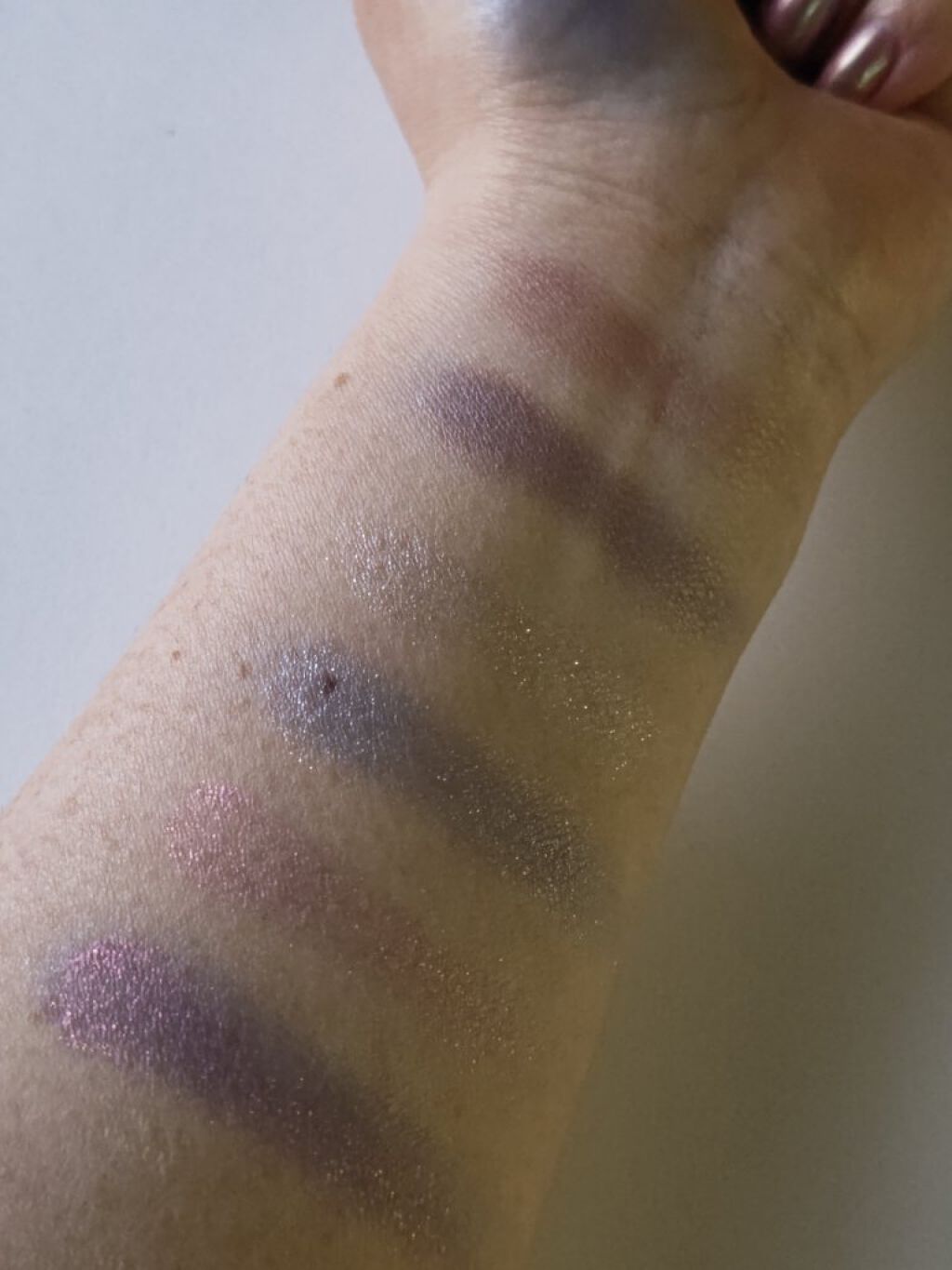 全体をパッと見るとグレージュ系のパレット よくよく見ると肌になじむピンクやモーヴもほんのり感じられる 右2色のラメは淡く儚げな輝き 上段は淡く、柔らかな色出し 右上のピンクラメでさりげない濡れツヤ感が出せる 左上はパール感あり 下段はココア系 ツールで発色をコントロールできるので ナチュラル仕上げにも、しっかりメイクしたい時にも使える ブラシでさらさら塗る➡️肌の自然な影のようになじむ アイシャドウベース+指塗り➡️強く発色する