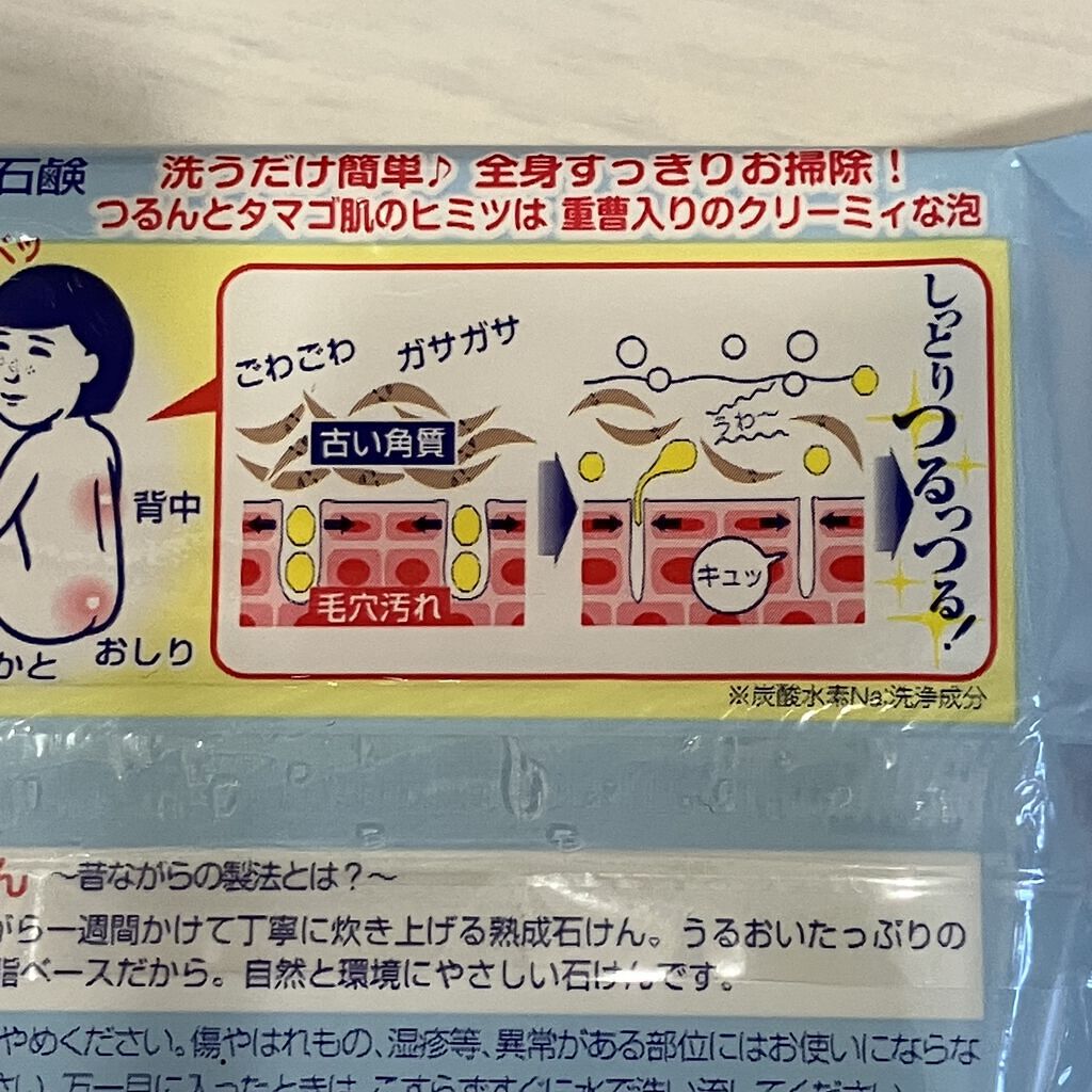 - 洗うだけ簡単、全身すっきりお掃除!つるんとタマゴ肌のヒミツは重曹(炭酸水素Na:洗浄成分)をふくんだクリーミーな泡。古い角質をゆるめ毛穴の奥から汚れを浮かせます。うるおいたっぷりの上質な泡立ちと泡切れは100%植物油脂ベースだから。自然と環境に優しい石けんです。 ●じっくりコトコト炊き上げ釜炊き熟成石けん。 ●たっぷり使える155g。全身用に。 ●防腐剤・色素・香料無添加。