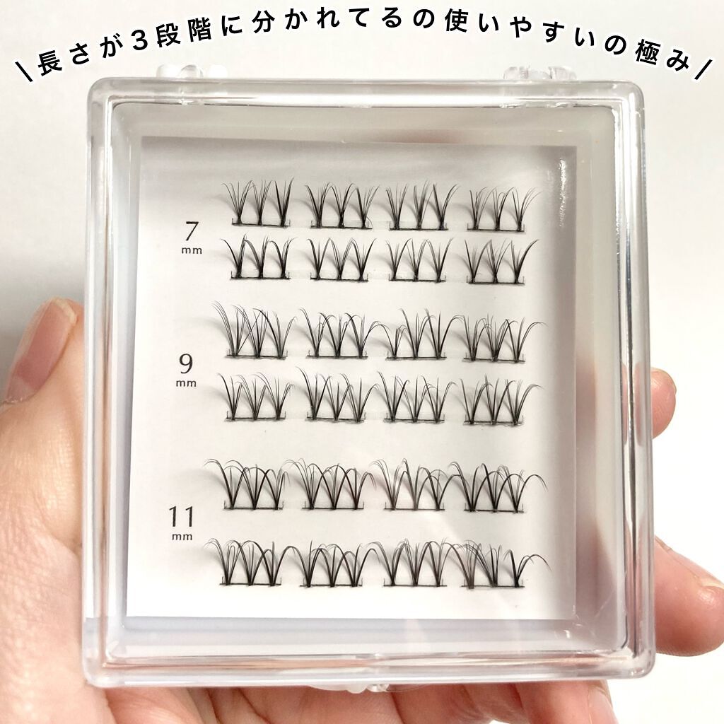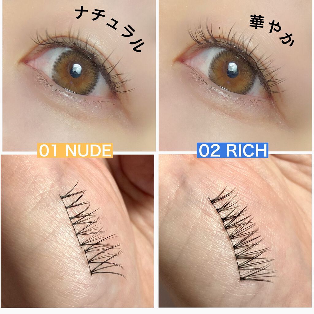 - 全6種 つけまのりで簡単に“ちょい足し”できる、自分で出来るまつげエクステ。なりたいイメージに合わせて目元の印象をコントロールできます。01,02(3束タイプ):毛束の間隔をあえて広めにデザインして、抜け感のある目元に。3束をまとめて装着するのであっという間にまつげエクステ仕上がりが叶います。03~06(1束タイプ):まつげの下から1束ずつ装着するから、自まつげと馴染んで自然な仕上がりに。クッキリ盛れる束感まつげや、ふわっと軽い立体まつげも簡単&キレイに仕上がります。