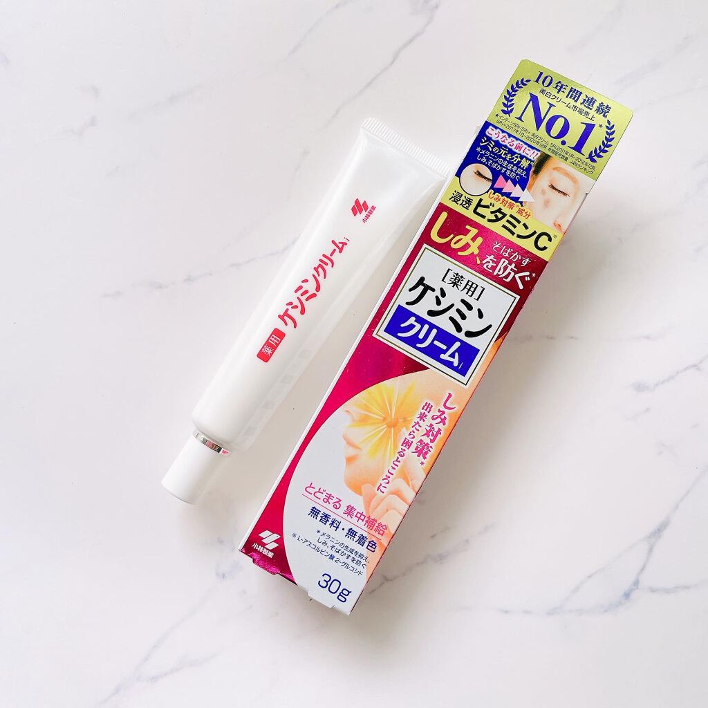 ケシミンクリームjを使用しました😊シミ対策クリームになっております✨ビタミンC誘導体がシミの元を分解してシミを防いでくれます。血行促進成分であるビタミンEを配合した顔全体に広がる伸びの良いクリームです。バージニアホワイト+配合でうるおいに満ち...