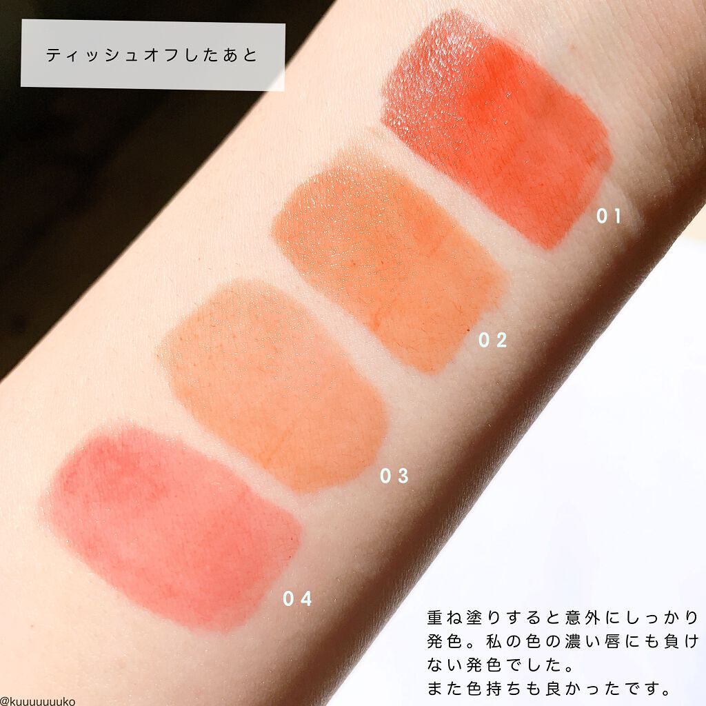 体温で溶けるメルトタイプでやわらかくするする塗れます。 見たままのカラーで発色しっかり。 つやうる唇に👄 初回は塗った直後はスースー感あり。 2回目からはほとんど何も感じなかったです✨ 私はイエベなので02、03と01もお気に入りです💛