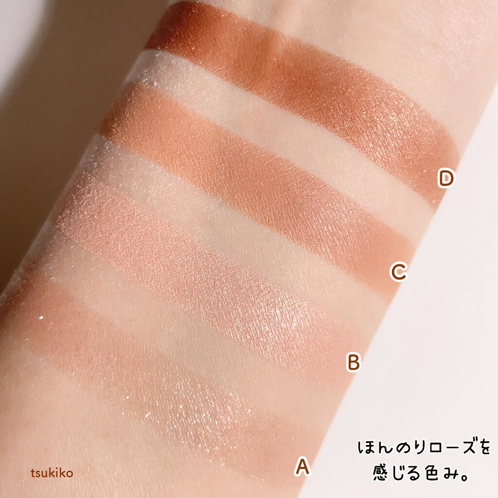 - ラメ・パール・マット3質感の4色アイシャドウ。 肌馴染みの良いベージュを基調としたカラー。ラメ・パール・マットの3質感を重ねて、自然にまぶたを強調し奥行のある大きな目元へ。 しっとり溶け込むような柔らかなパウダーなので、スルスル伸びてまぶたにピタッと密着。保湿成分(スクワラン・ホホバ種子油)配合。