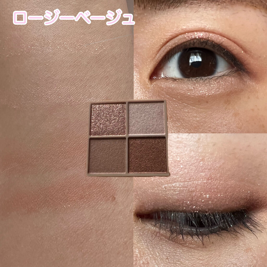 発色はナチュラルでとても可愛いです このお値段でこのクオリティはすごいと思いました。 🥜01ナッツベージュザ・ベージュって感じのカラー締め色を加えることで立体感ある目元になります。右上がパール左下がマットしめ色はほんのり艶感のあるマット。個人的にはマットが可愛いです 02ロージーベージュブルベ向けかなと思ったけどイエベでも使えそうピンクーって感じはないので誰でも使いやすいです! 📎おすすめの使い方📎ブラシで塗る際は、柔らかめのブラシをお勧めします!ふわりと発色してくれるので可愛いです。 硬いのだとポロポロ出るし発色もイマイチ。 あと、左上のラメを使わないー!このラメがあまり綺麗に見せてくれないのでラメなしでも可愛いのでぜひ!! 使い方を工夫すれば全然使えます!!