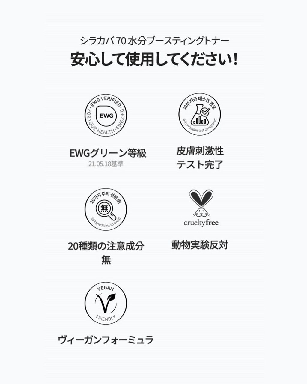 - <シラカバ 70% 水分ブースティングトナー> シラカンバ樹液、水、DPG、グリセリン、1,2-ヘキサンジオール、メチルプロパンジオール、ヒアルロン酸Na、加水分解ヒアルロン酸、キュウリ果実エキス、ヒアルロン酸、ベタイン、パンテノール、エチルヘキシルグリセリン、(アクリレーツ/アクリル酸アルキル(C10-30))クロスポリマー、アラントイン、プロパンジオール、トロメタミン、ヒアルロン酸クロスポリマーNa、加水分解ムコ多糖、ベンジルグリコール、BG、デキストリン、トコフェロール、グルコノラクトン、クチナシエキス