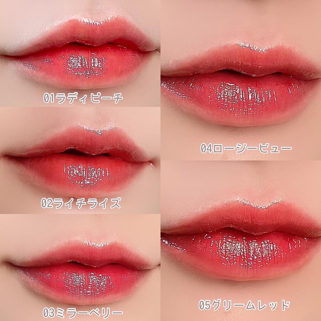 とにかく質感がしーっとりととろけるバームテクスチャーで、保湿力はかなり高い! 少しペタペタもしますが密着力もあるので色持ち良し♪ マスクレスの時にぜひ使いたいぷるぷるでツヤがきれいな仕上がりです。 カラー展開も豊富で、イエベさん向けブルベさん向け揃ってます☆ 私のお気に入りは01と05♡ そして08 Coraliaも可愛くって好き! 6月からドラッグストアにも展開予定だそうですよ♡