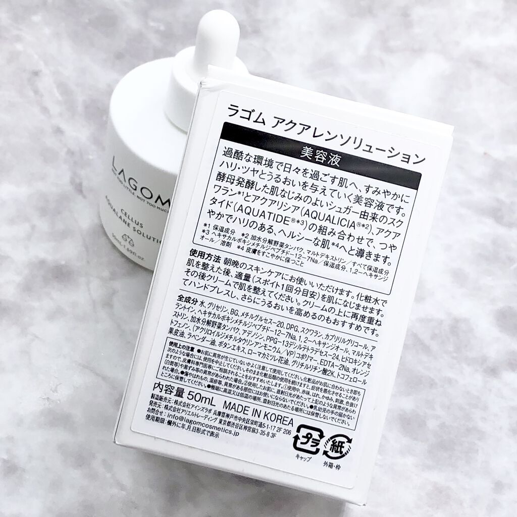 - ライフスタイルの複雑化、紫外線や外気の汚れ、マスク装着による肌刺激など、肌を取り巻く環境はトラブル*1に満ちています。ラゴムは「肌そのものが健やかであること」を目指したシンプルケアを提唱していますが、うるおいの補填、ハリツヤケア、そして肌荒れケアの3点において、起爆剤となるような頼もしい美容液が必要と考えました。 アクアレンソリューションは、この3点をすみやかに叶え、肌になめらかなハリと静かな自信をもたらす美容液です。酵母発酵した肌なじみのよいシュガー由来のスクワラン*2とアクアリシア(AQUALICIA®*3)、アクアタイド(AQUATIDE®*4)の組み合わせで、つややかでハリのある、ヘルシーな肌*5へと導きます。 ・韓国での肌刺激テスト済※ ・MADE IN KOREA ※すべての人に刺激が起こらないわけではありません *1 乾燥、肌荒れなど *2 保湿成分 *3 加水分解野菜タンパク、マルトデキストリン/すべて保湿成分 *4 ヘキサカルボキシメチルジペプチド-12-7Na/保湿成分、1,2-ヘキサンジオール/溶剤 *5 皮膚をすこやかに保つこと