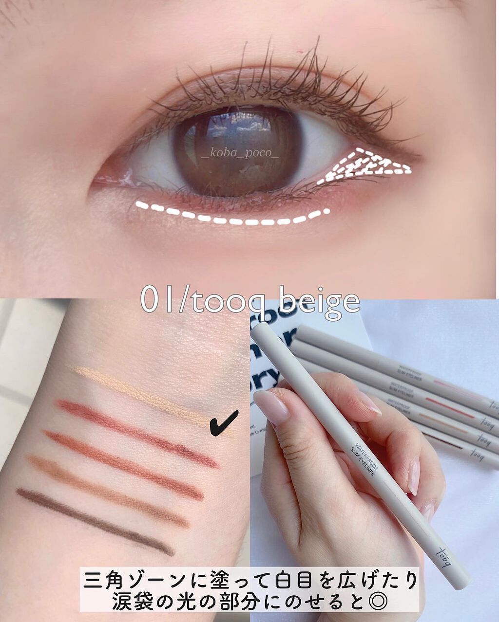 - トゥークならではの特別工法で作られたウォータープルーフ&オイルプルーフアイライナー。 2mmのスリムな厚さで繊細で完成度が高く、にじまない強力な固定力があります。 シャワー時にこすっても落ちないほど汗と油分に強いように製作してます。 カラーは全10種類で、奥ゆかしい目元表現と奥妙に見えるカラーで目元を自然に拡張してくれます。 そのうちシグネチャーカラーであるトゥークベージュは自然に目を拡張できるカラーで、粘膜に塗って切開メイクで使われます。 なめらかなつけ心地でヨレにくいです。 新カラーのトファサーモンは薄いピンクにアプリコットカラーが混ざって自然でふっくらした涙袋を作ってくれる魅力的な人気カラーです。 また、外部の空気が流入しない特許を取得したエアタイト容器で簡単に固まらず、初めて使用する時のような柔らかいつけ心地を維持してくれます。