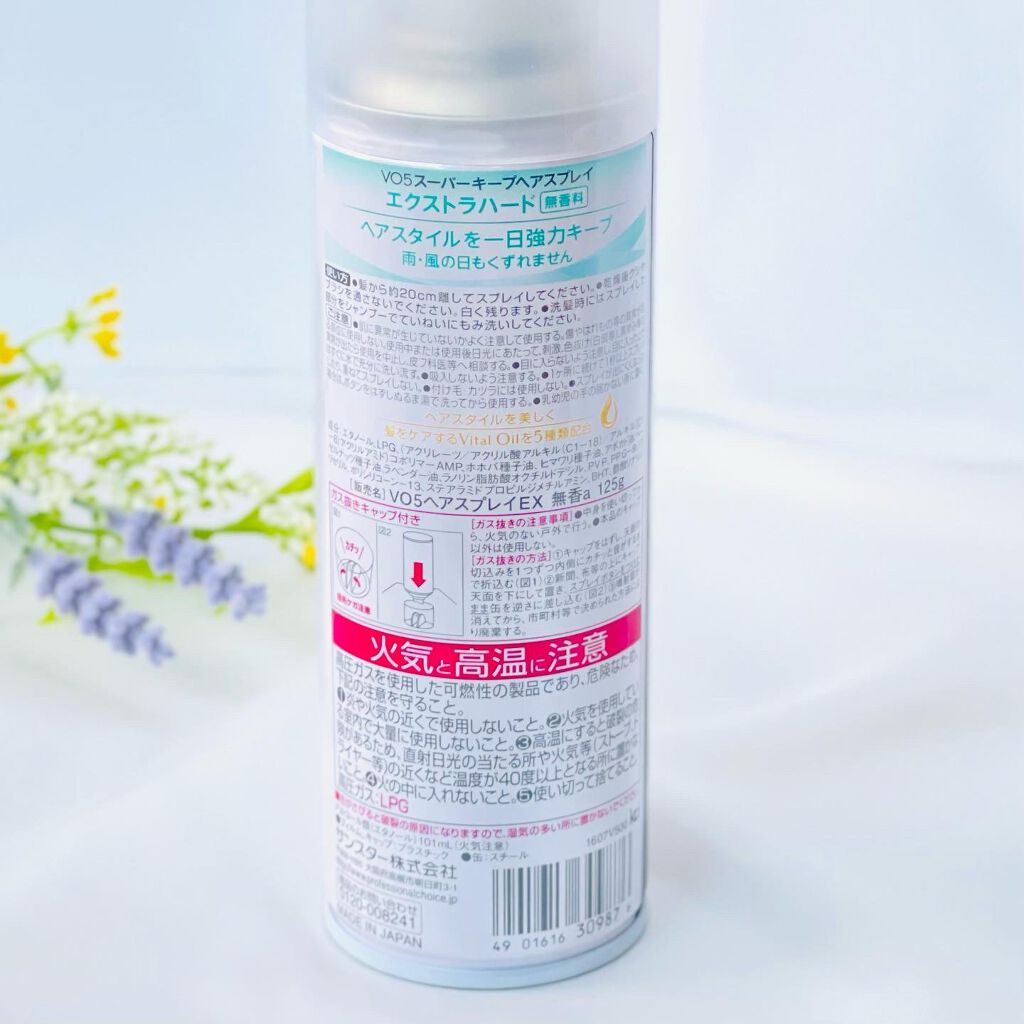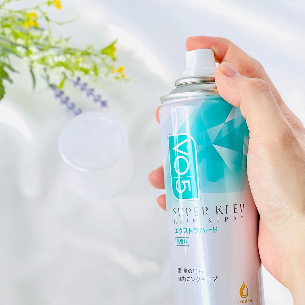 ✴︎VO5スーパーキープヘアスプレイ<エクストラハード>無香料 ¥850髪型をしっかり固めて長時間キープ雨や風の日でもスタイルが崩れにくい☂️ベタつかず乾燥後に白く粉を吹く心配も少ない髪をケアする“5種類のVitalOil”(ホホバ種子油...