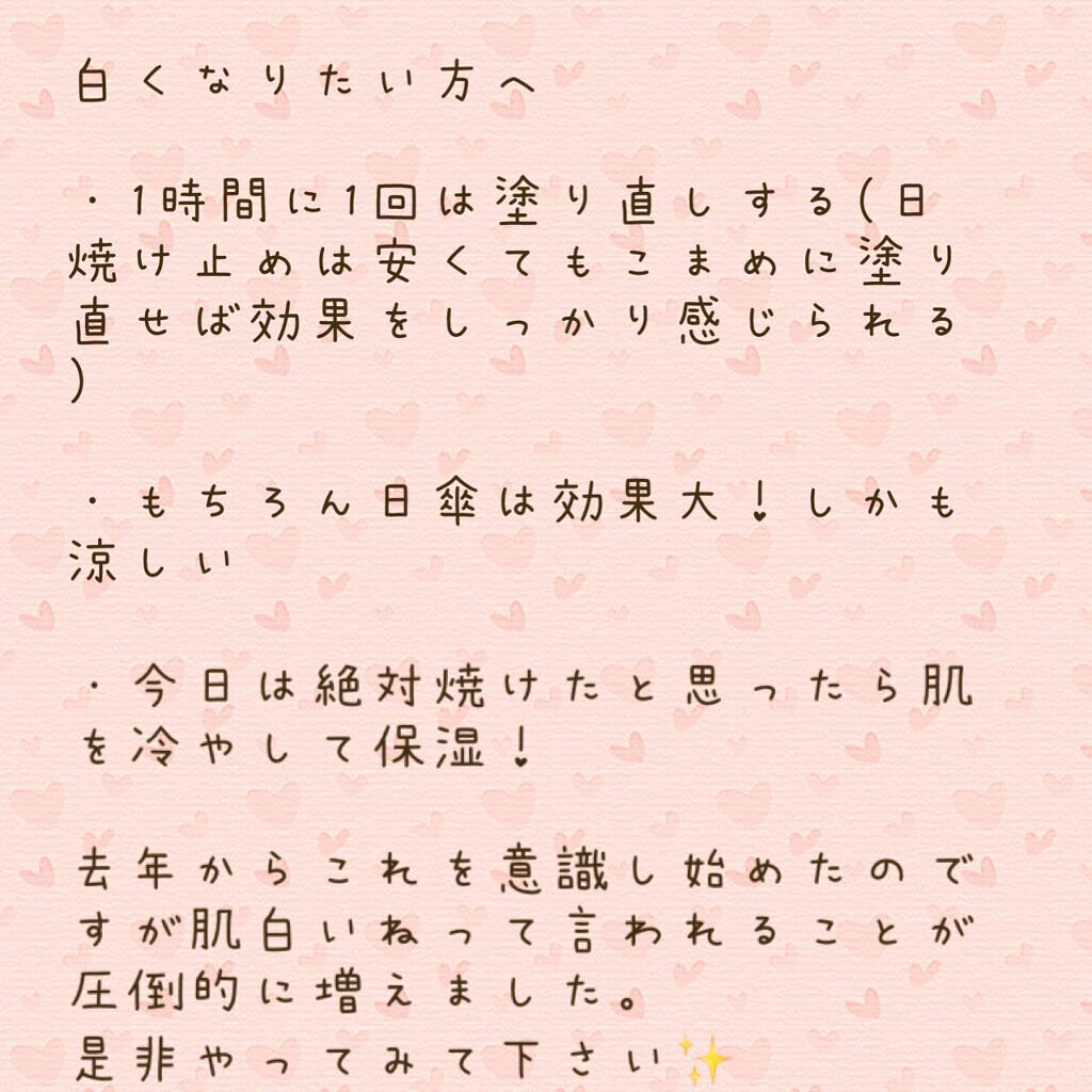 | 日焼け止め・UVケアランキング第10位 | ふわっとした硬めのクリームだけど、 するっと伸びが良く、 なじませているうちに水感を感じ、 なじむとベタつきなく さらっと軽い使い心地だよ。 | 詳細を見る | |