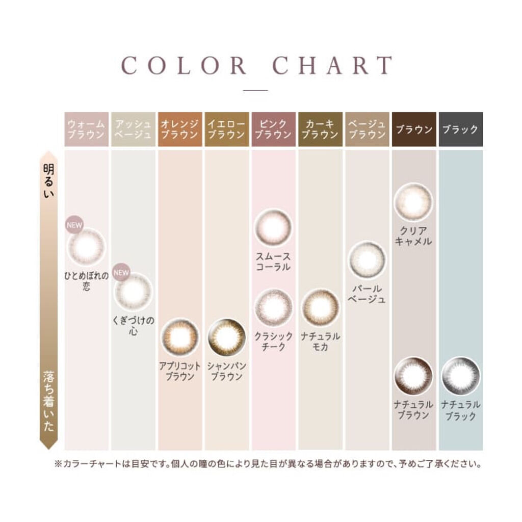 - ※2023年6月〜製品ラベルのデザインを一部変更いたします(順次切替予定)。尚これに係る商品の返品・交換等は承っておりません。 ”もっとバレずに盛れる” レンズデザインに極小ドットを採用することで、本来の瞳の色に溶け込むように馴染み、よりバレにくいナチュラルな仕上がりに。 ■パールスノーグレー(Pearl Snow Gray) ちゅるんとした絶妙グレーで透明感と抜け感のある瞳になれるデザイン。 ■テディモカ(Teddy Mocha) 甘モテ♡色っぽちゅるんオトナのミュートブラウン くりっと甘い盛り感で色気ただよう、ちゅるんな瞳 ■ミルクブラウニー(Milk Brownie) “ナチュ盛り♡ふわちゅるん”ピュアなブラウンベージュ 柔らかなミルクブラウンで甘さたっぷり、ピュアな瞳 DIA:14.5mm BC:8.7mm 中心厚:0.08mm( -3.00D ) 含水率: 38.6%(※ナチュラルブラウン、シャンパンブラウン、ナチュラルブラック) 42.5%(※アプリコットブラウン・ナチュラルモカ・クラシックチーク・クリアキャメル・パールベージュ・スムースコーラル・くぎづけの心・ひとめぼれの恋・パールスノーグレー・テディモカ ・ミルクブラウニー) カラーコンタクトレンズの不適正使用による眼障害の危険性等などがあります。 ●コンタクトレンズは高度管理医療機器です。不十分な洗浄・消毒など不適切なケアや、長時間・交換期間を超えた装用により、アレルギー性結膜炎、角膜感染症、角膜潰瘍等の重篤な眼障害が発生する危険性があります ●ご使用前に取扱説明書を確認してください 使用上の留意事項 ●眼科医院等を受診してからお求めください ●眼に異常を感じたら直ちにレンズ使用を中止し、お近くの眼科等で診察を受けてください ●医師の指示にしたがってご使用ください ●コンタクトレンズを装用する場合、自覚症状がなくても、眼科医院等での定期検査を受けてください ●レンズに不具合がある場合は使用しないでください