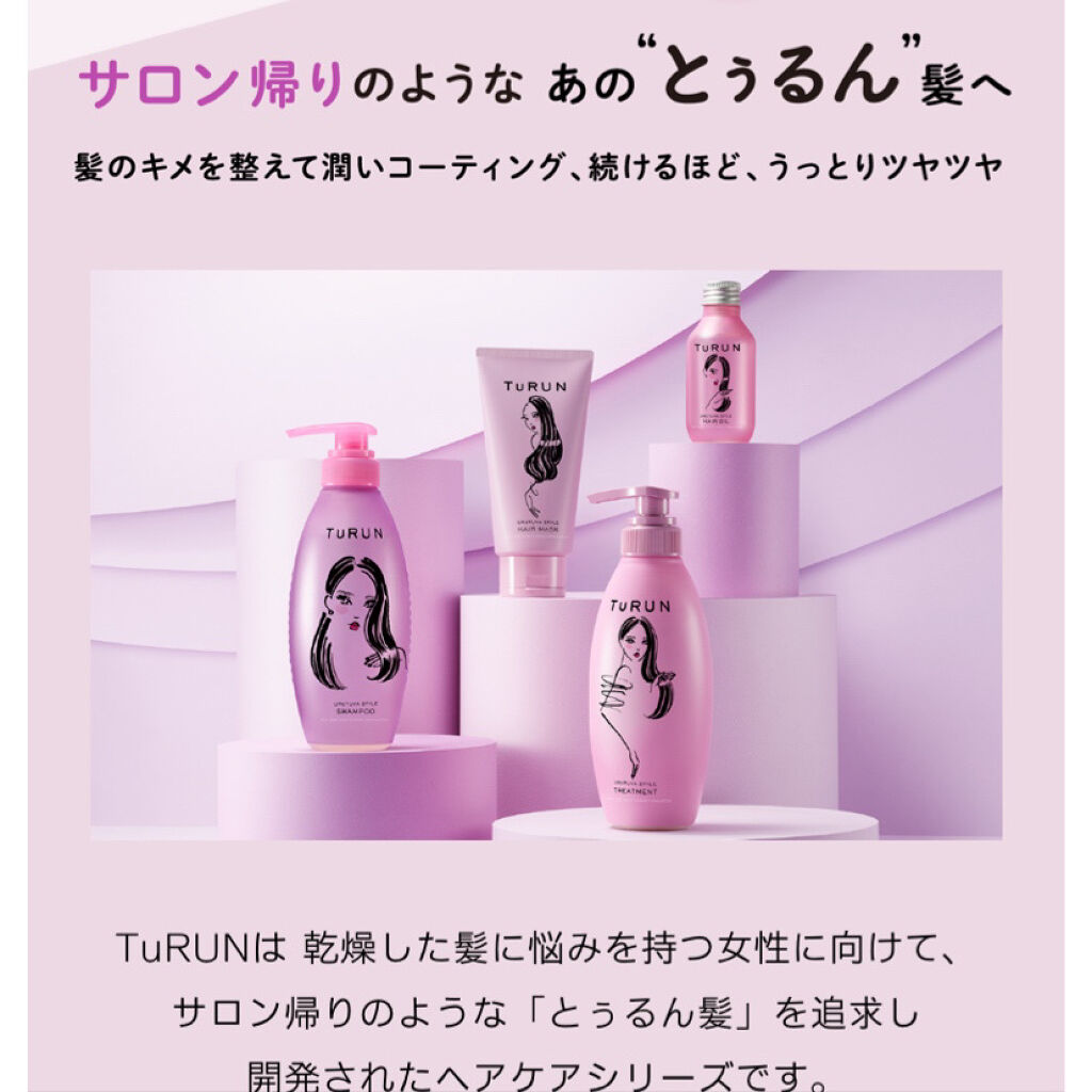 - 「TuRUN」は、乾燥した髪に悩みを持つ女性に向けて、サロン帰りのような“とぅるん”髪を追求し開発されたヘアケアシリーズです。360度モイストチャージ処方で、パサついた髪 1 本 1 本の内側まで保水美容液成分*2を濃密浸透させることで髪にうるおいを与えるとともに、傷んだ髪のキューティクルのキメを整えうるおいコーティングしてみずみずしいツヤを与えることで、うるおいとツヤが満ちた仕上がりを実現。毎日のデイリーケアで、アップル・ラズベリー・シダーウッドのみずみずしい果実の香りとともに、サロン帰りのような“とぅるん”髪へと導きます。 シャンプー、トリートメント、ヘアマスク、ヘアオイルの4種のヘアケアを展開します。 *2 加水分解水添デンプン(保湿成分)…シャンプー・トリートメント・ヘアマスクに配合。 ※一部ECサイトにて先行発売 2022/4/18(一部店舗にて限定販売)