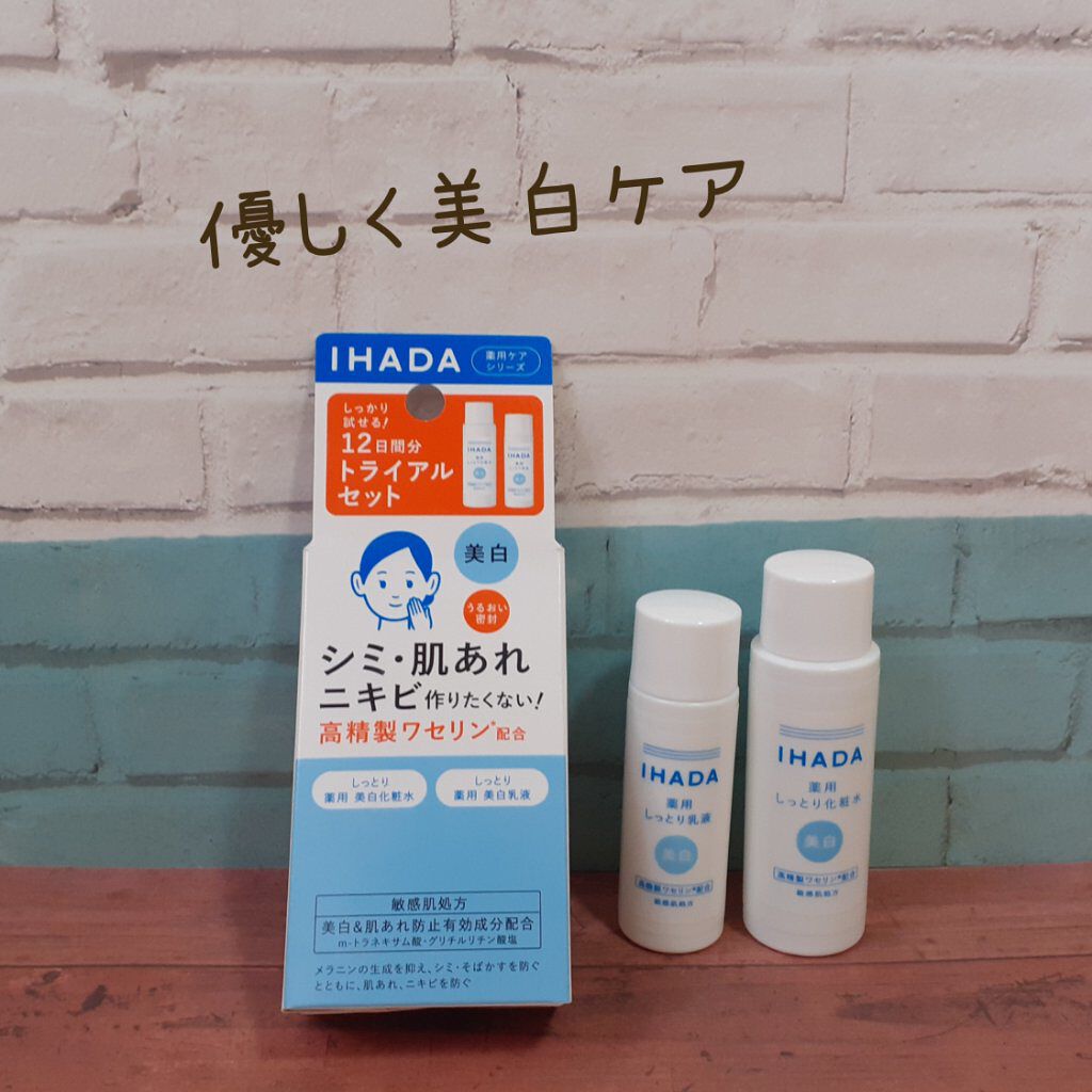 - 【医薬部外品】 新パッケージへリニューアル。 不純物の少ない「高精製ワセリン」配合。 肌の透明感をそこなう3大要因「シミ・ソバカス」「肌荒れ・乾燥」「ニキビ」を防ぐとともに肌のうるおいバリア機能を守り、みずみずしく透明感ある健やかな素肌に整える、敏感肌設計の薬用美白*スキンケアセットです。 薬用クリアローション、薬用クリアエマルジョンの2品を約1週間たっぷりお使い頂けます。 ○厳選原料・成分配合 ○パラベン(防腐剤)無添加、アルコール(エチルアルコール)無添加 ○無香料、無着色、弱酸性〇アレルギーテスト済み・ニキビのもとになりにくい処方(全てのかたにアレルギーが起きない、また、ニキビができないわけではありません。) 【セット内容】 ・イハダ 薬用クリアローション (医薬部外品) 25mL ・イハダ 薬用クリアエマルジョン (医薬部外品) 15mL *美白とは、メラニンの生成を抑え、シミ・そばかすを防ぐこと ※商品の改良や表示方法の変更などにより、実際の成分と一部異なる場合があります。実際の成分は商品の表示をご覧ください。