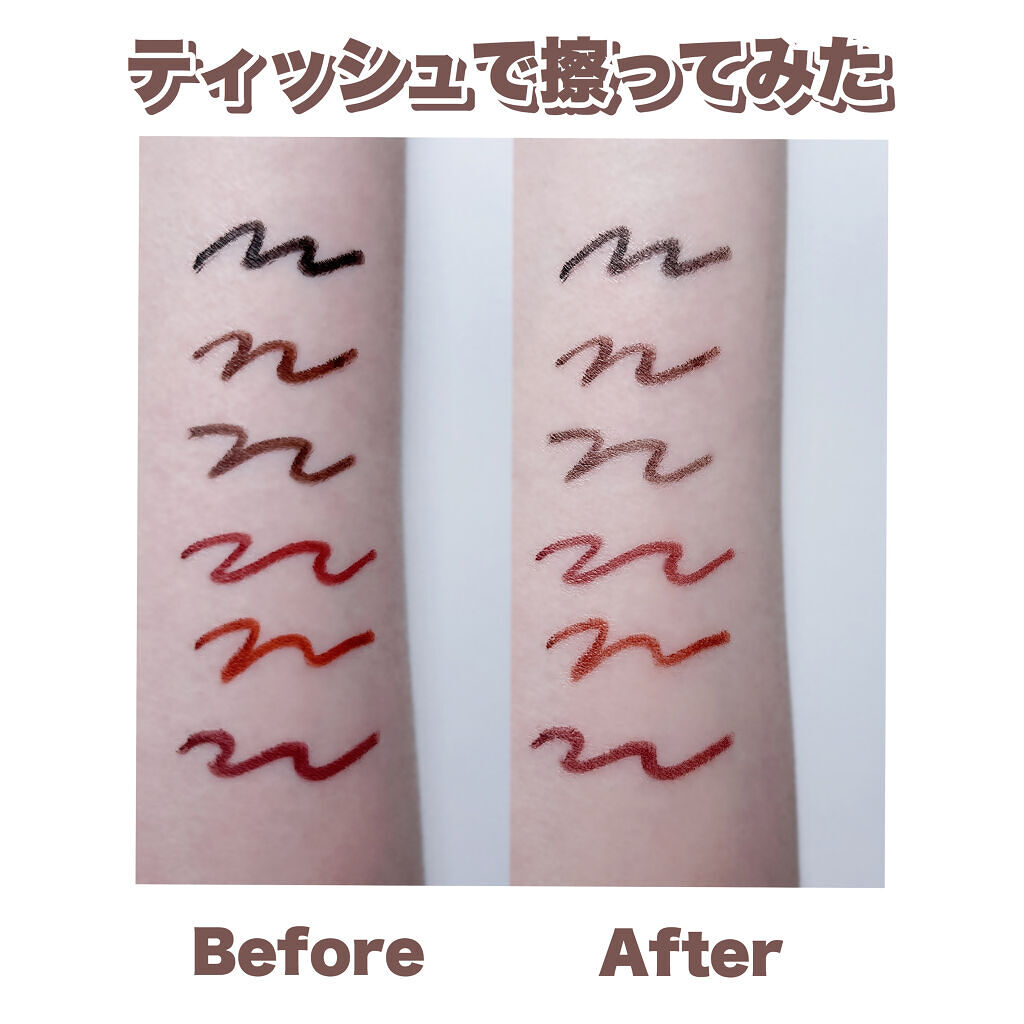 - <01 ディープブラック> メチルトリメチコン、トリメチルシロキシケイ酸、(アクリレーツ/アクリル酸ステアリル/メタクリル酸ジメチコン)コポリマー、ポリエチレン、カルナウバロウ、キャンデリラロウ、ジメチコン、水添レシチン、シリカ、メタクリル酸メチルクロスポリマー、トコフェロール、スクワラン、ホホバ種子油、マカデミア種子油、ヒアルロン酸Na、メチコン、(+/-)水酸化Al、酸化鉄、マイカ、酸化チタン <02 ミディアムブラウン> メチルトリメチコン、トリメチルシロキシケイ酸、(アクリレーツ/アクリル酸ステアリル/メタクリル酸ジメチコン)コポリマー、ポリエチレン、カルナウバロウ、キャンデリラロウ、ジメチコン、水添レシチン、シリカ、メタクリル酸メチルクロスポリマー、トコフェロール、スクワラン、ホホバ種子油、マカデミア種子油、ヒアルロン酸Na、メチコン、(+/-)水酸化Al、酸化鉄、マイカ、酸化チタン <03 ダークブラウン> メチルトリメチコン、トリメチルシロキシケイ酸、(アクリレーツ/アクリル酸ステアリル/メタクリル酸ジメチコン)コポリマー、ポリエチレン、カルナウバロウ、スクワラン、ジメチコン、水添レシチン、シリカ、トコフェロール、メタクリル酸メチルクロスポリマー、キャンデリラロウ、ホホバ種子油、マカデミア種子油、ヒアルロン酸Na、メチコン、水酸化Al、酸化鉄、酸化チタン、マイカ <04 ガーネットバーガンディ> メチルトリメチコン、トリメチルシロキシケイ酸、(アクリレーツ/アクリル酸ステアリル/メタクリル酸ジメチコン)コポリマー、ポリエチレン、カルナウバロウ、ジメチコン、キャンデリラロウ、水添レシチン、シリカ、トコフェロール、メタクリル酸メチルクロスポリマー、スクワラン、ホホバ種子油、マカデミア種子油、ヒアルロン酸Na、メチコン、水酸化Al、酸化鉄、グンジョウ、酸化チタン、マイカ <06 フォギープラム> メチルトリメチコン、トリメチルシロキシケイ酸、(アクリレーツ/アクリル酸ステアリル/メタクリル酸ジメチコン)コポリマー、ポリエチレン、カルナウバロウ、ジメチコン、キャンデリラロウ、水酸化Al、水添レシチン、シリカ、トコフェロール、メタクリル酸メチルクロスポリマー、スクワラン、ホホバ種子油、マカデミア種子油、ヒアルロン酸Na、メチコン、酸化鉄、グンジョウ、酸化チタン、マイカ <07 アズキブラウン> メチルトリメチコン、トリメチルシロキシケイ酸、(アクリレーツ/アクリル酸ステアリル/メタクリル酸ジメチコン)コポリマー、ポリエチレン、カルナウバロウ、キャンデリラロウ、ジメチコン、水添レシチン、シリカ、トコフェロール、メタクリル酸メチルクロスポリマー、スクワラン、ホホバ種子油、マカデミア種子油、水酸化Al、ハイドロゲンジメチコン、ヒアルロン酸Na、メチコン、酸化鉄、グンジョウ、マイカ、酸化チタン <09 ダージリンピンク> メチルトリメチコン、トリメチルシロキシケイ酸、(アクリレーツ/アクリル酸ステアリル/メタクリル酸ジメチコン)コポリマー、合成ワックス、カルナウバロウ、キャンデリラロウ、ジメチコン、水酸化Al、ハイドロゲンジメチコン、水添レシチン、シリカ、トコフェロール、メタクリル酸メチルクロスポリマー、スクワラン、ホホバ種子油、マカデミア種子油、ヒアルロン酸Na、メチコン、酸化鉄、酸化チタン、マイカ、グンジョウ <11 クラウディーグレー> メチルトリメチコン、トリメチルシロキシケイ酸、(アクリレーツ/アクリル酸ステアリル/メタクリル酸ジメチコン)コポリマー、合成ワックス、カルナウバロウ、ジメチコン、キャンデリラロウ、水酸化Al、水添レシチン、シリカ、トコフェロール、メタクリル酸メチルクロスポリマー、ハイドロゲンジメチコン、スクワラン、ホホバ種子油、マカデミア種子油、ヒアルロン酸Na、メチコン、酸化鉄、酸化チタン、マイカ <15 カプチーノピンク> メチルトリメチコン、トリメチルシロキシケイ酸、(アクリレーツ/アクリル酸ステアリル/メタクリル酸ジメチコン)コポリマー、合成ワックス、カルナウバロウ、ジメチコン、キャンデリラロウ、水酸化Al、水添レシチン、シリカ、トコフェロール、メタクリル酸メチルクロスポリマー、スクワラン、ホホバ種子油、マカデミア種子油、ヒアルロン酸Na、メチコン、酸化チタン、酸化鉄、マイカ <05 ビターキャラメル> メチルトリメチコン、トリメチルシロキシケイ酸、(アクリレーツ/アクリル酸ステアリル/メタクリル酸ジメチコン)コポリマー、ポリエチレン、カルナウバロウ、ジメチコン、キャンデリラロウ、水添レシチン、シリカ、トコフェロール、メタクリル酸メチルクロスポリマー、スクワラン、ホホバ種子油、マカデミア種子油、ヒアルロン酸Na、メチコン、水酸化Al、酸化鉄、マイカ、酸化チタン <08 マッチャカーキ> メチルトリメチコン、トリメチルシロキシケイ酸、(アクリレーツ/アクリル酸ステアリル/メタクリル酸ジメチコン)コポリマー、合成ワックス、