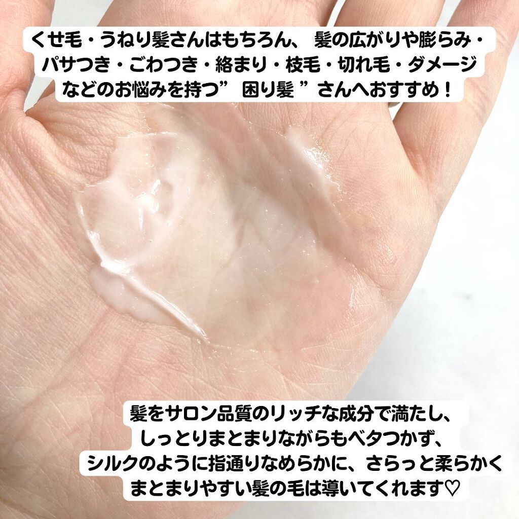 | ヘアケア・スタイリングランキング第46位 | 透明でとろっとしたテクスチャーで髪に伸ばしやすくしっとりツヤ感 でもドライヤーのあとはさらっとしています。 | 詳細を見る | |
