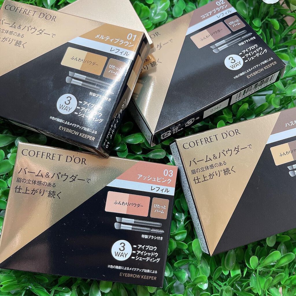 - ぴたっとバームとふんわりパウダーで眉の毛流れ、立体感のある仕上がり※、続くシェーディングやアイシャドウにも使えるアイブロウパレット ※色の陰影によるメイクアップ効果による ぴたっと密着バーム&ふんわり定着パウダーの合わせ使いで、汗・マスク着用時の蒸気にも対応し、毛が生えていない部分も消えにくい、ウォータープルーフタイプ。 ● バームとパウダーの質感の使い分けで、より精密な毛流れや影を表現。 ● シェーディングやアイシャドウまで、顔中使えるマルチタイプ。 ● 使い心地にもこだわった特製ブラシ付き。 コフレドール アイブロウキーパー 全4 種 3.0g こちらの商品は詰め替え用〈レフィル〉です。別売りのアイブロウキーパー用ケースにセットしてお使いください。 アイブロウキーパー用ケース1種(税込770円 ※編集部調べ) 01メルティブラウン(ライトブラウン系) 02ココアブラウン(ブラウン系) 03アッシュピンク(ピンク系) 04ハスキーグレー(グレー系) <数量限定:初回限定版> シェーディングやアイシャドウにも使えるマルチタイプで、絶妙なニュアンスカラーを揃えたウォータープルーフタイプのアイブロウパレットのレフィルにケースがついた便利なセット。 セット内容 コフレドール アイブロウキーパー3.0ℊ(現品) コフレドール アイブロウキーパー用ケース(現品)