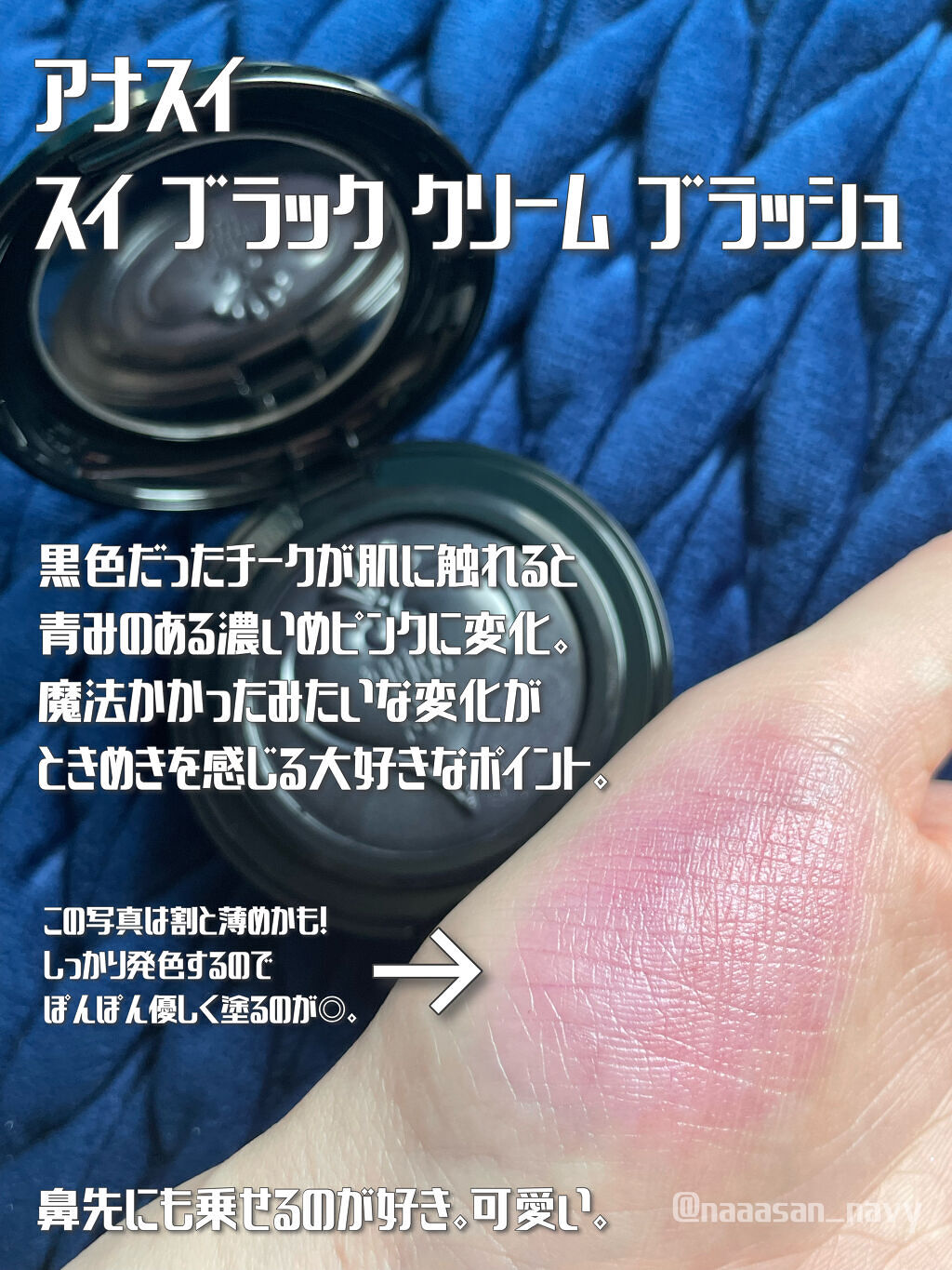漆黒からバラ色にチェンジする、まるでマジックのようなティントタイプのチーク。肌の水分に反応したときに初めて変色するので、自分だけのチークメイクが楽しめます。 上品で落ち着きのあるティーローズの香り🌹良い香りに包まれながらメイクするのは至福の時間🌹 青みがかったようなピンクでとっても可愛い。夜までしっかり塗ったままの状態が保たれていて、ティント効果もばっちり🫶🏻
