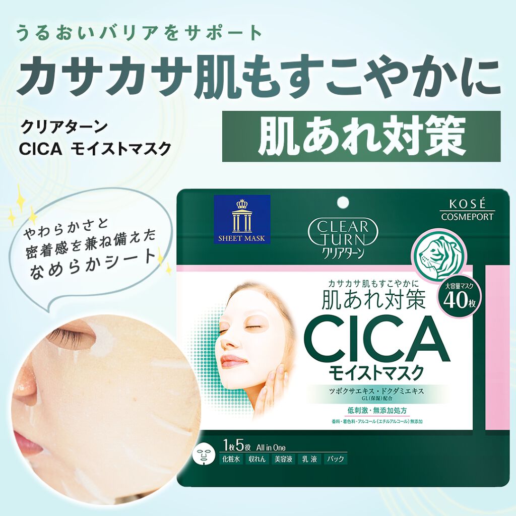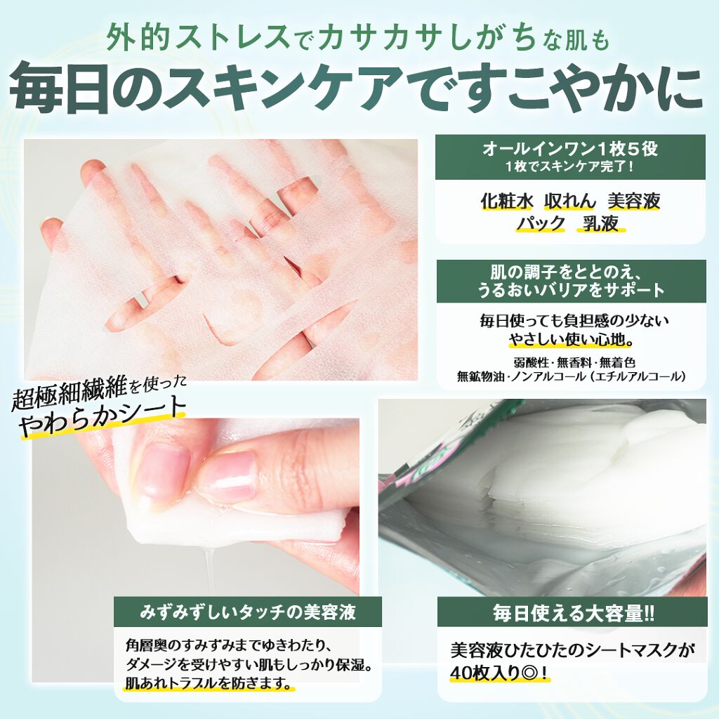 - カサカサ肌もすこやかに 肌あれ対策のCICAモイストマスク! 1.毎日の肌あれケアに。CICAケア オールインワンマスク みずみずしいタッチの美容液が角層奥のすみずみまでゆきわたり、ダメージを受けやすい肌もしっかり保湿。 肌あれトラブルを防ぎます。 1品5役:化粧水+収れん+美容液+乳液+パック 2 肌の調子をととのえ、うるおいバリアをサポート 毎日使っても負担感の少ないやさしい使い心地。角層内部の水分・油分のバランスをととのえ、すこやかな肌をキープします。 3 やわらかさと密着感を兼ね備えたなめらかシート 超極細繊維を使ったシートで肌をやさしく包みこみます。100%バイオマス由来のシートマスクで、 環境により配慮した素材を使用しています。
