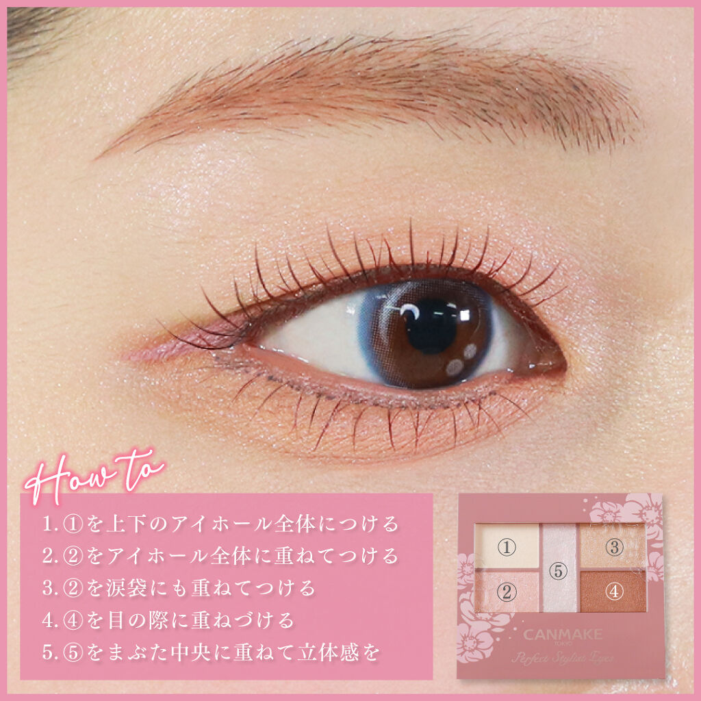 - 1枚のパレットで2つのスタイルが完成! 5色の欲ばりアイシャドウ♥ メインカラーを選んで2つのスタイルが楽しめる! A→B→D でスタイル1 A→C→D でスタイル2 繊細な粉質が、しっとりとまぶたに密着して色落ちを防ぎます。 透明感のあるキラうるトッピングジュエル(繊細ラメ)は、気分によってトッピング!