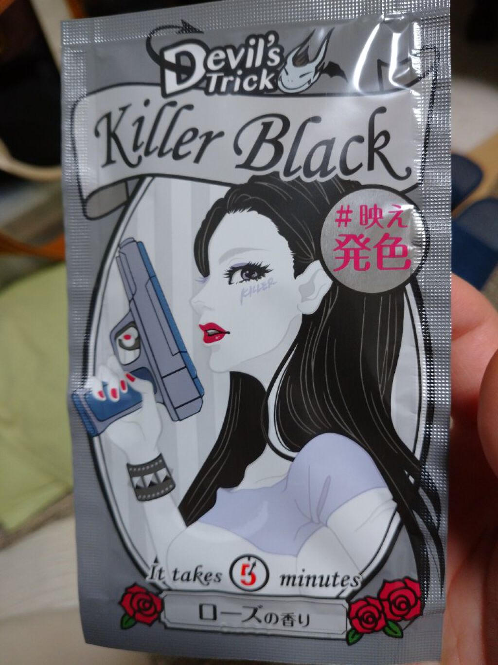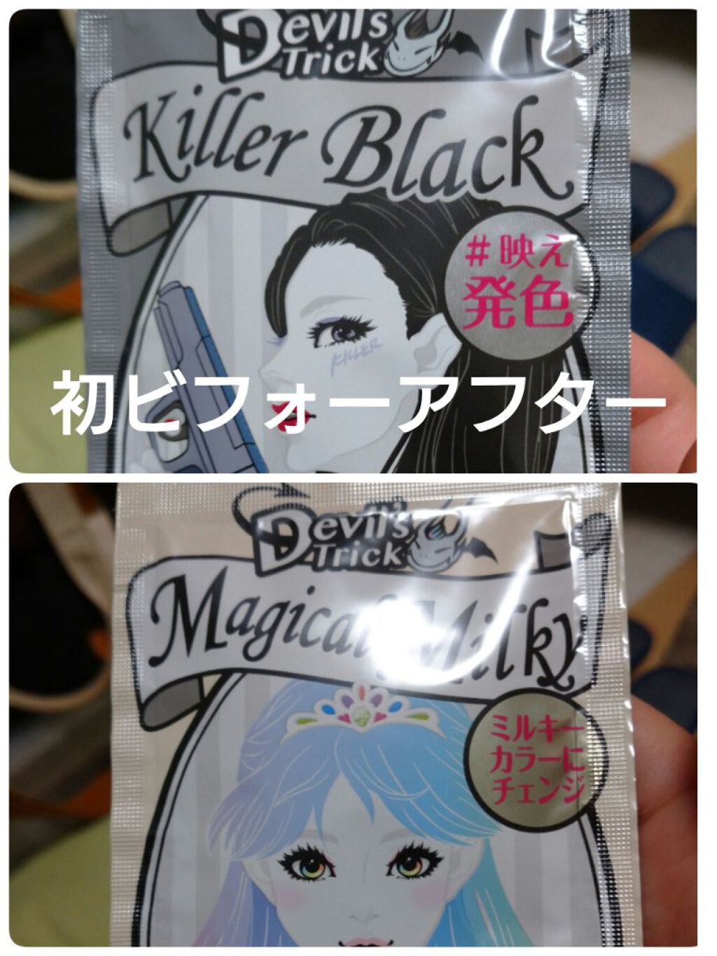クイスクイスデビルズトリック キラーブラックとマジカルミルキー 発色は綺麗なんだけどそろそろプリンが気になる┐(´д`)┌ 黒髪は染まらないので注意してください! 色持ちはこの色が2週間くらい持ちます。