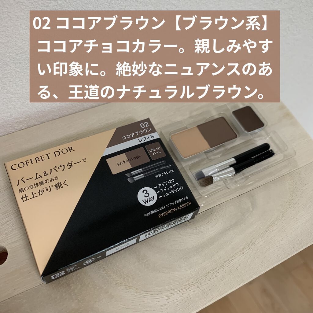 - ぴたっとバームとふんわりパウダーで眉の毛流れ、立体感のある仕上がり※、続くシェーディングやアイシャドウにも使えるアイブロウパレット ※色の陰影によるメイクアップ効果による ぴたっと密着バーム&ふんわり定着パウダーの合わせ使いで、汗・マスク着用時の蒸気にも対応し、毛が生えていない部分も消えにくい、ウォータープルーフタイプ。 ● バームとパウダーの質感の使い分けで、より精密な毛流れや影を表現。 ● シェーディングやアイシャドウまで、顔中使えるマルチタイプ。 ● 使い心地にもこだわった特製ブラシ付き。 コフレドール アイブロウキーパー 全4 種 3.0g こちらの商品は詰め替え用〈レフィル〉です。別売りのアイブロウキーパー用ケースにセットしてお使いください。 アイブロウキーパー用ケース1種(税込770円 ※編集部調べ) 01メルティブラウン(ライトブラウン系) 02ココアブラウン(ブラウン系) 03アッシュピンク(ピンク系) 04ハスキーグレー(グレー系) <数量限定:初回限定版> シェーディングやアイシャドウにも使えるマルチタイプで、絶妙なニュアンスカラーを揃えたウォータープルーフタイプのアイブロウパレットのレフィルにケースがついた便利なセット。 セット内容 コフレドール アイブロウキーパー3.0ℊ(現品) コフレドール アイブロウキーパー用ケース(現品)
